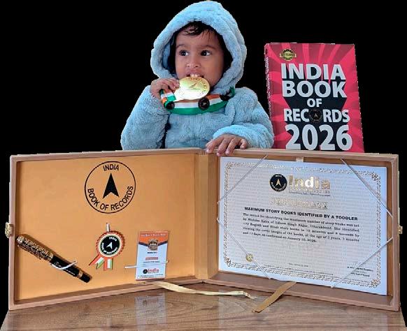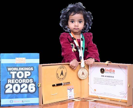 Mishita Rathore (born on March 6, 2023) of Gautam Buddha Nagar, Uttar Pradesh, is titled as ‘IBR Achiever’ for identifying and naming 20 fruits, 21 vegetables, 20 farm animals, 10 colours, 10 shapes, 15 vehicles and 25 parts of the body; reciting days of the week, months in a year, 8 planets and all the letters of the English alphabet with associated words; recalling 8 national symbols and 3 traffic signals; and counting from 1 to 50, at the age of 2 years and 9 months, as confirmed on December 12, 2025.