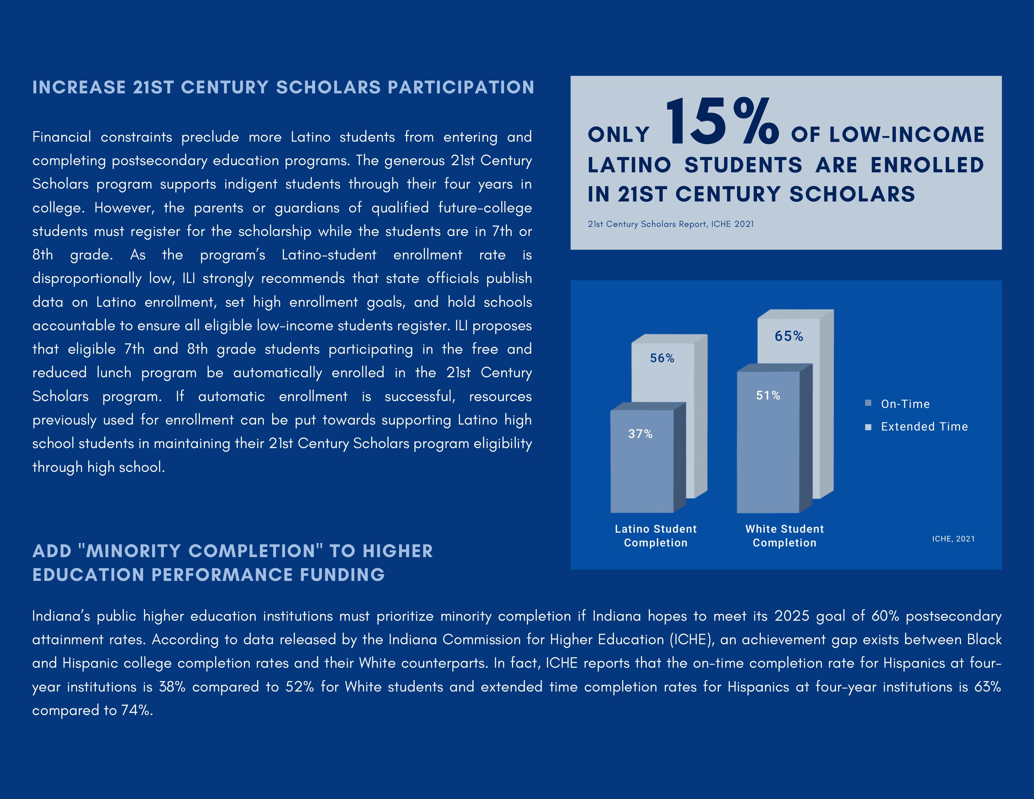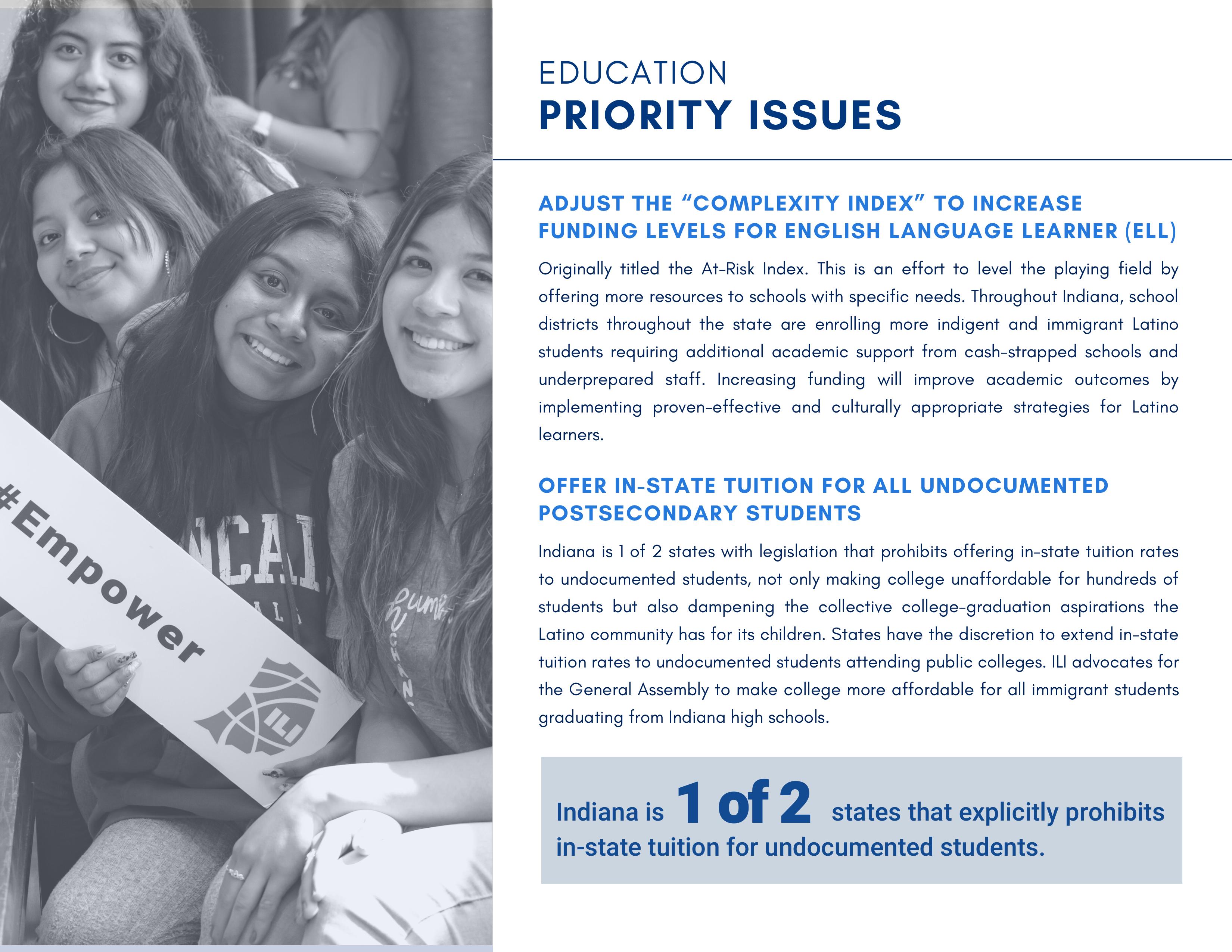 The Indiana Latino Institute (ILI)'s 2023 Legislative Agenda reflects where the issues currently stand and provides insight into the goals ILI and other advocates hope to achieve. It is critical that we have public policy that addresses community advancement through workforce development, education, health, and public safety to positively impact Indiana socially, culturally, and economically.