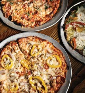 PIZZA The personal-sized pies are presented on thin, fermented crusts at this Bargersville establishment run by the folks who own the neighboring Taxman Brewing Company. But the menu has surprising range. Shared plates include a jumbo ball of fresh burrata oozing over caramelized onions and blistered tomatoes, delicate beef carpaccio, and a version of octopus in squid-ink sauce that is not for the faint of heart. Chase your bites with sips of the When in Rome bourbon cocktail that has hints of lemon and basil, or pick anything off of the extensive spirits menu that includes a section dedicated to prosecco spritzes and trending aperitifs and digestifs. For dessert, do not pass up the baseballsized scoops of buttery-sweet housemade gelato in creamy, complex flavors such as raspberry, chunky pistachio, and a lovely Italian stracciatella rippled with slivers of shaved chocolate. 75 N. Baldwin St., Bargersville, 317-771-3165, pizza andlibations.com V $$$
