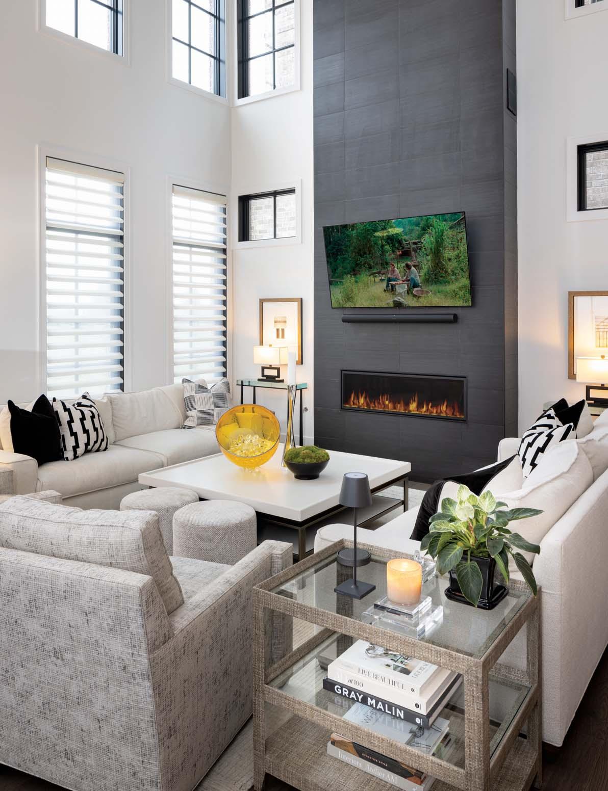 The two-story living room is outfitted with a pair of Lee Industries upholstered couches with waterfall cushions. Rob admits he never imagined fitting more than one sofa in the area, but the smooth silhouettes of the couches delineate the perimeter of the room. Between the twin sofas sits a sleek, white coffee table,