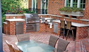 kitchen area. It is complemented by backsplashes in more quartzite, as well as ceramic tile above the Wolf range. Comfortable bar stools by Lee Industries abut the island, promising to provide eating space for the couple’s grandson and future grandchildren.