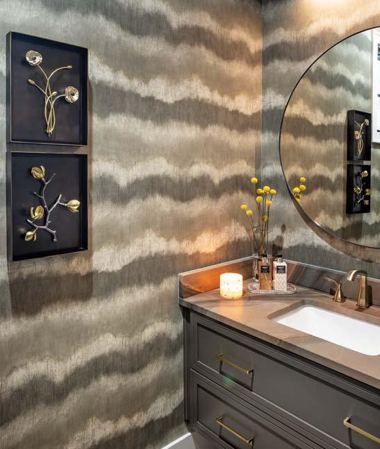 Myers and his clients intentionally chose a soft, putty-colored wall hue known as Gypsum for the entire home, allowing the furnishings and artwork to tell a visual story. Even the bathroom has its own art collection. Across the hall from the main bedroom, the powder room includes a framed photograph by Andy Chen and two Michael Aram floral shadow boxes. With striped wallpaper hung horizontally, the bathroom makes its own artistic statement. There’s still a spot for more art, but the couple is waiting for the right piece to find them.