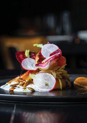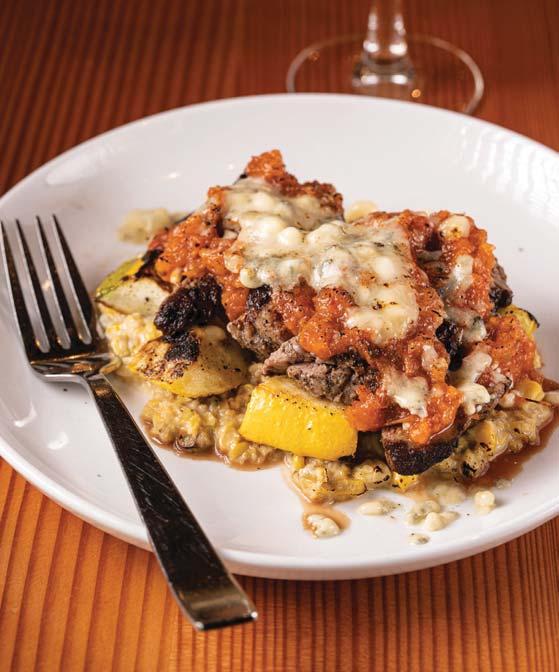 neighboring Taxman Brewing Company. But the menu has surprising range. Shared plates include a jumbo ball of fresh burrata oozing over caramelized onions and blistered tomatoes, delicate beef carpaccio, and a version of octopus in squid ink sauce that is not for the faint of heart. Chase your bites with sips of the When in Rome bourbon cocktail that has hints of lemon and basil, or pick anything off of the extensive spirits menu that includes a section dedicated to prosecco spritzes and trending aperitifs and digestifs. For dessert, do not pass up the baseball-sized scoops of buttery-sweet house-made gelato in creamy, complex flavors such as raspberry, chunky pistachio, and a lovely Italian stracciatella rippled with slivers of shaved chocolate. 75 N. Baldwin St., Bargersville, 317-771-3165, pizza andlibations.com V $$$