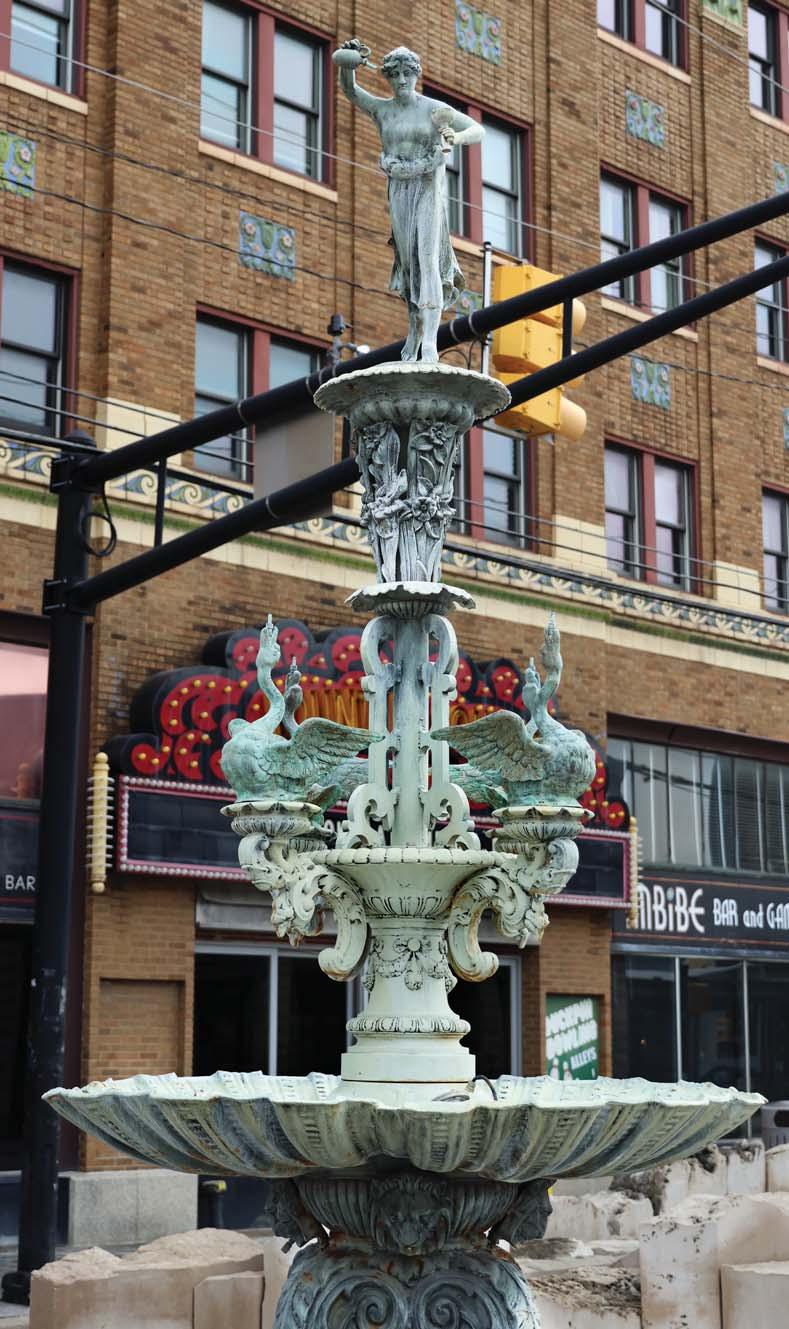 FOR MOST of its history, a public fountain positioned on a patch of land bordered by Virginia Avenue and Shelby and Prospect streets has served as the centerpiece of the Fountain Square neighborhood. But what many don’t realize is that it hasn’t always been the same fountain. The original one, a rather generic specimen ordered from a Pennsylvania company, was erected in 1889, quickly lending the neighborhood its name. In those days, the immediate environs hosted a streetcar turnaround and terminus, which loaned the area a second, unofficial name: The End. Surmounted by the statue of a girl (traditionally held to be the Greek goddess of youth, Hebe) and nicknamed Lady Spray, the fountain served as a drinking spot for both horses and people, as well as the default meeting place for the German, Irish, and Italian immigrants who settled the area. Since local merchants and residents helped pay for it, it was sometimes also called the Subscription Fountain. It was destroyed in the late 1910s, allegedly by a careless truck driver. Its replacement, featuring a sculpture of a pioneer family by artist Myra Reynolds Richards, was dedicated in 1924. By 1954, the traffic in the neighborhood had increased exponentially, so the city, stating that the area had grown too hectic, moved the fountain to Garfield Park. The pioneers remained there until 1969, when community pressure brought them back to Fountain Square. In 2009, they moved again to the newly minted Pioneer Plaza, a stone’s throw from their original location, and a new sculpture, purchased from Robinson Ironworks in Alabama and selected because of its resemblance to the truckshattered Lady Spray, was installed in their place. There she remains to this day—and hopefully for many more days to come.