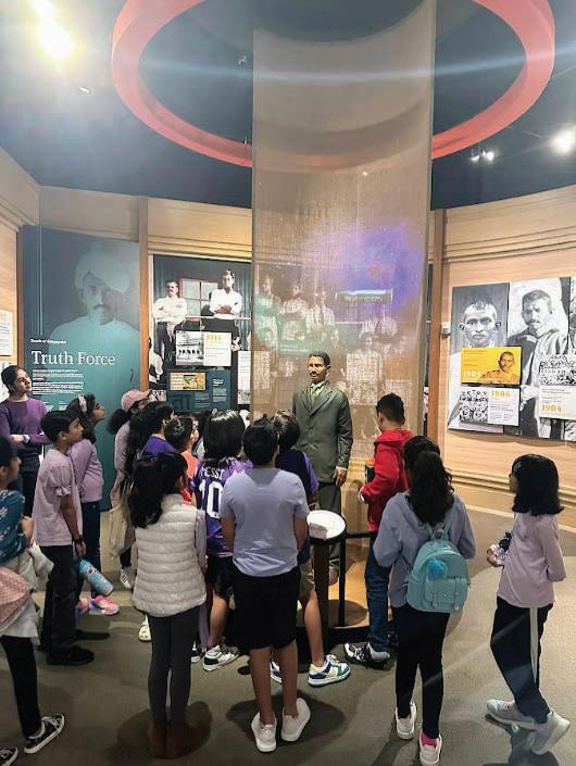 The students were guided by museum docents and embarked on a journey through time, exploring photographs and interactive displays that illuminated the profound impact of Gandhi and other peace leaders on shaping the course of history. Engrossed in stories of nonviolent resistance and courageous activism, the students gained a deeper understanding of the power of nonviolence, compassion, empathy, and perse-