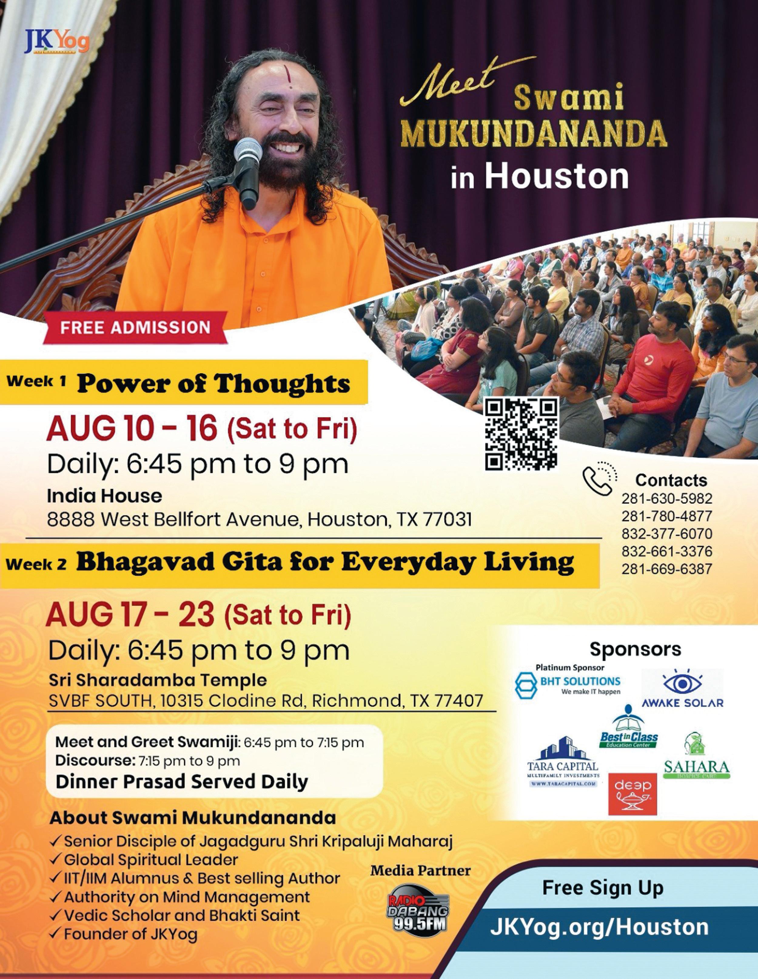 Houston: His Holiness Shree Swami Mukundananda will be visiting Houston to conduct the Life Transformation Program (LTP) starting from August 10th. LTP offers a comprehensive approach to personal growth and empowerment, centered around this year’s theme, “The Power of Thoughts,” inspired by Swamiji’s bestselling book, and the Bhagavad Gita - The Song of God.