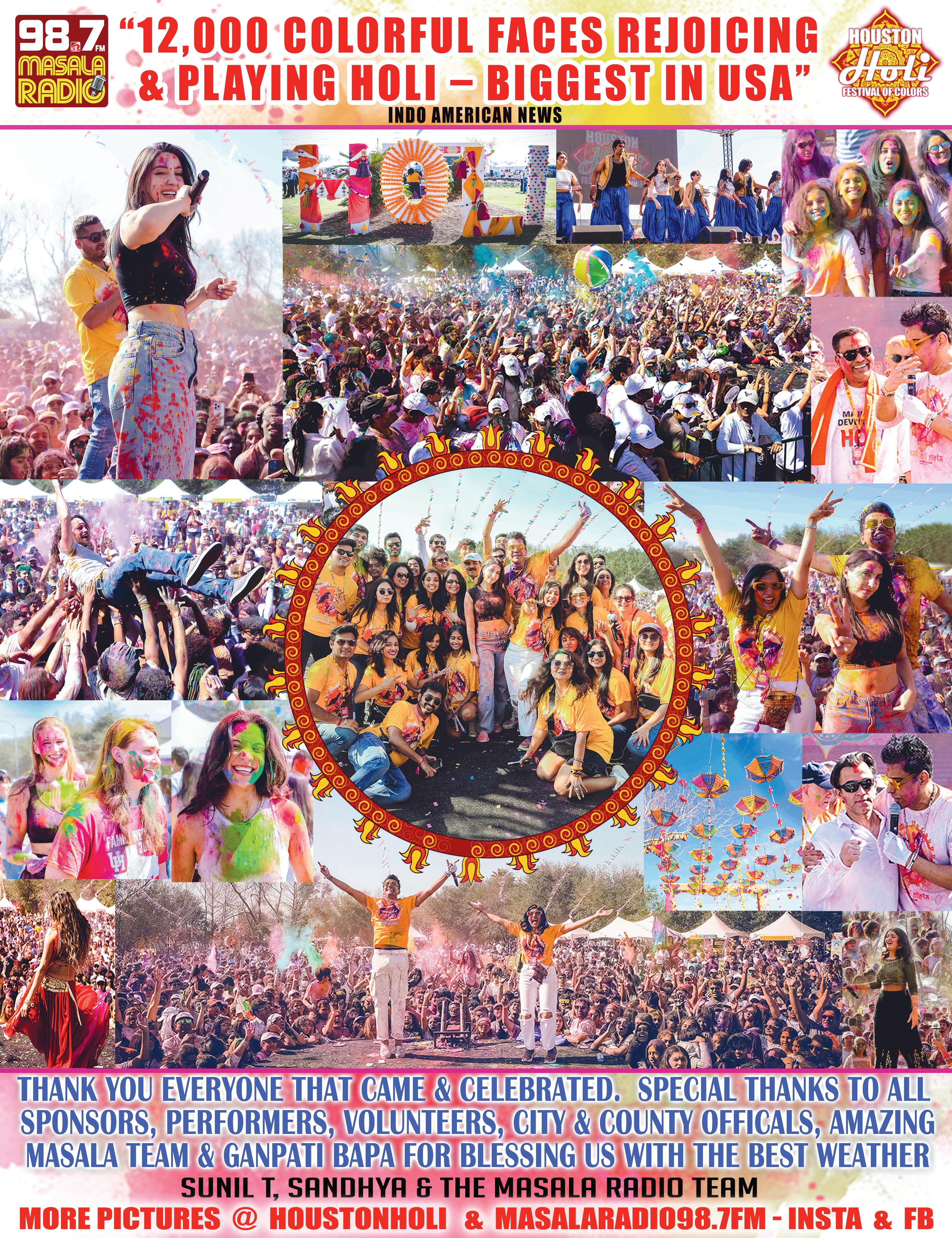 55 Crazy Masala Crew turned this 16th Annual Houston Holi Festival of Colors into one of the smoothest ever! Office Management: Rinku, Jigisha, Vyoma, Aahil, Nilesha, Vidya & Badal. Event Logistics: Ruchir, Ninad, Sohail, & Naila. Stage: Mehran, Suji, Dilip, Preanka, Bhavisha, Josh, Nikhil, Sandeep, Eesha, Sofia, Sahil T, Vinay, Harshin, Alkesh & Jyotsana. Radio Jockeys: Anish, Amit, Ina & Swati. Volunteers: Simran T & Priyanshi. Ticketing Rishita, Abhishek, Varalakshmi, Abhishruth, Priya, Santhosh, Bharadwaj, Victor, Romit. Parking: Surya, Nitin, Krishna, Rahul, Sudheer, Prudhvi. Info: Shivangi & Bindi. Kids Rides Nikhtha, Chitra, Sravani. Ruchira & Santhosh. Photo & Video: Gaurav Hariyant Studios, Joshua Escalante, Aman Amin. Photos & Videos on HoustonHoli.com / Facebook & Instagram Houston Holi and MasalaRadio 98.7FM.