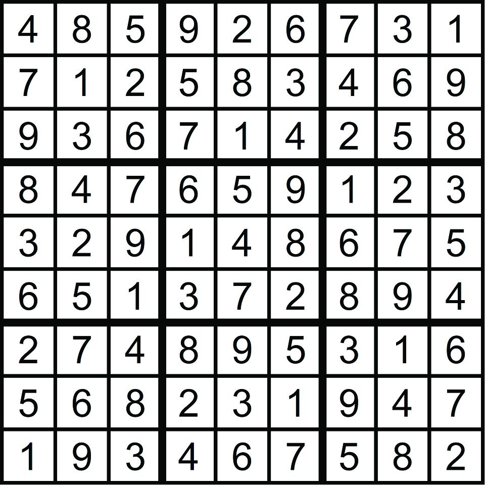 Place a number in the empty boxes in such a way that each row across, each column down and each 9-box square contains all of the numbers from one to nine.