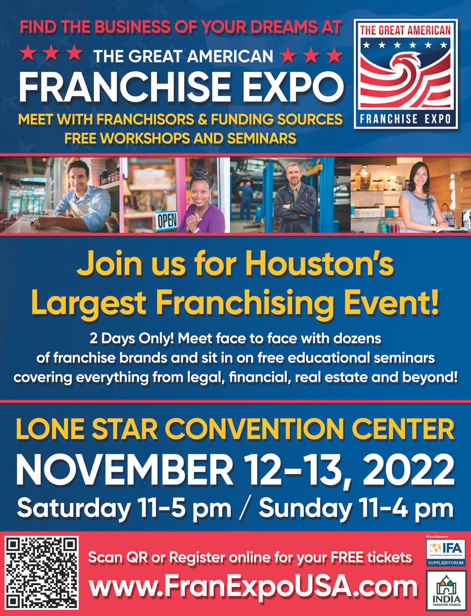 Conroe: The Franchise Expo to be held Novem ber 12 and 13 at the Lone Star Convention Center in Conroe offers an excel lent opportunity for busi ness hopefuls to learn the intricacies of the franchise world. It is a chance to learn about the latest and greatest franchise business mod els.