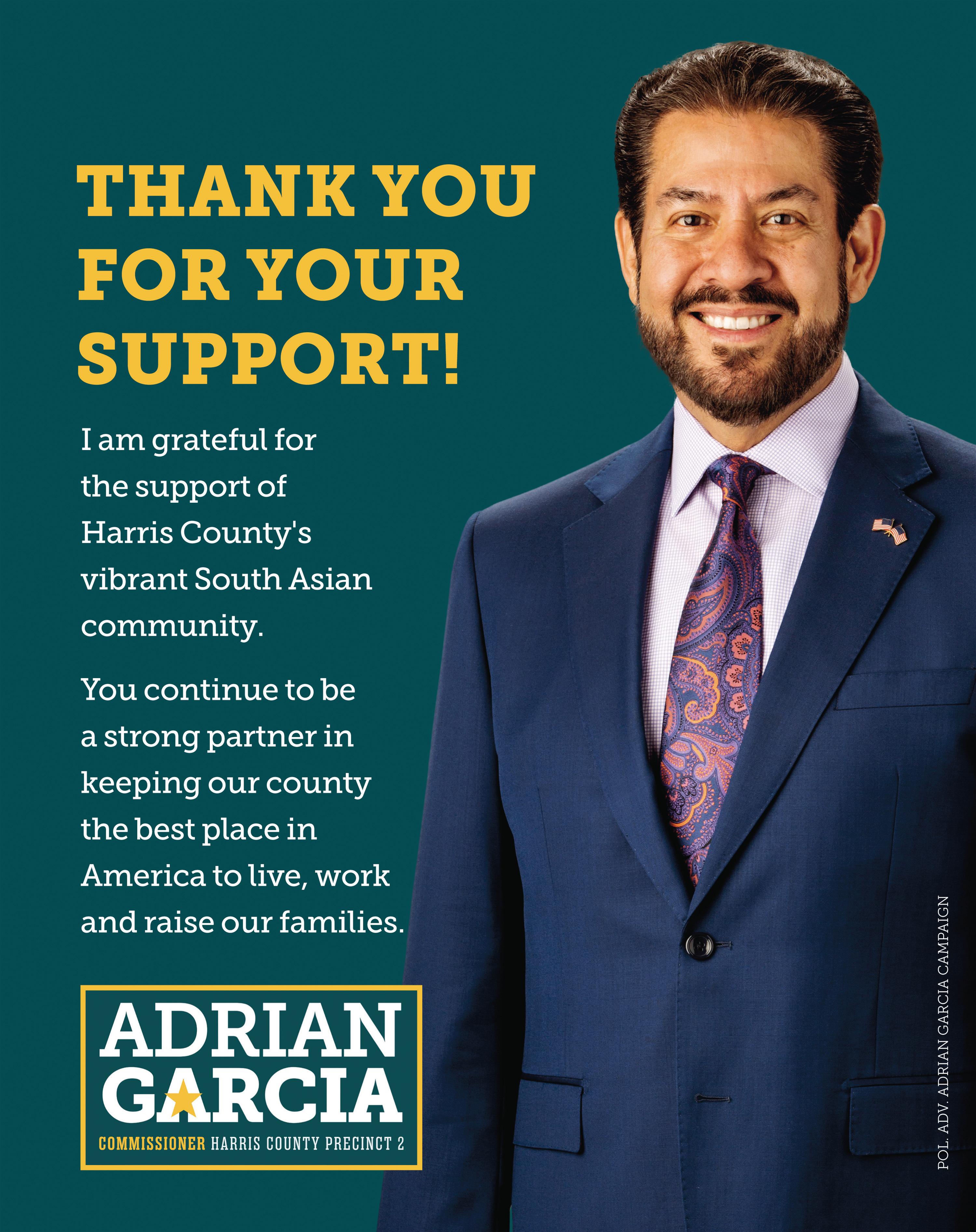 Houston: Democrat incumbent KP George will serve another term as Fort Bend County judge with a narrow victory over Republi can challenger Trever Nehls. Fi nal unofficial voting results show George received 51.6% of the vote, or 126,828, to Nehls’ 48.4%, or 119,082, with all 82 Fort Bend County polling locations report ing. The first two Muslim lawmak ers in the Texas House are Sal man Bhojani, who won election to House District 92 in Tarrant
