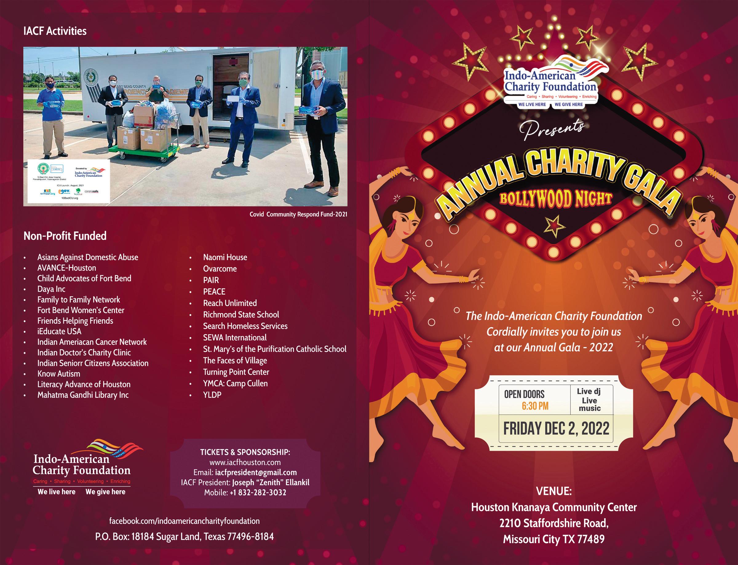 Houston: The Indo-American Charity Foundation (IACF) will hold its annual gala on Friday, December 2nd 2022, at Knanaya Community Center in Missouri City. The theme for this year’s gala is “Bollywood Night”. The event will showcase IACF’s supporting charities, individuals and organiza tions that share its mission to serve communities in the Greater Hous ton area.