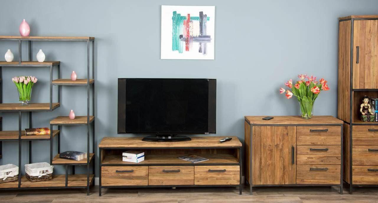 An industrial TV stand made from teak wood and a metal frame is a stunning piece of furniture that combines the natural beauty of teak with the raw, edgy appeal of metal. This blend of materials creates a unique, functional, and stylish addition to any living room or entertainment space.
