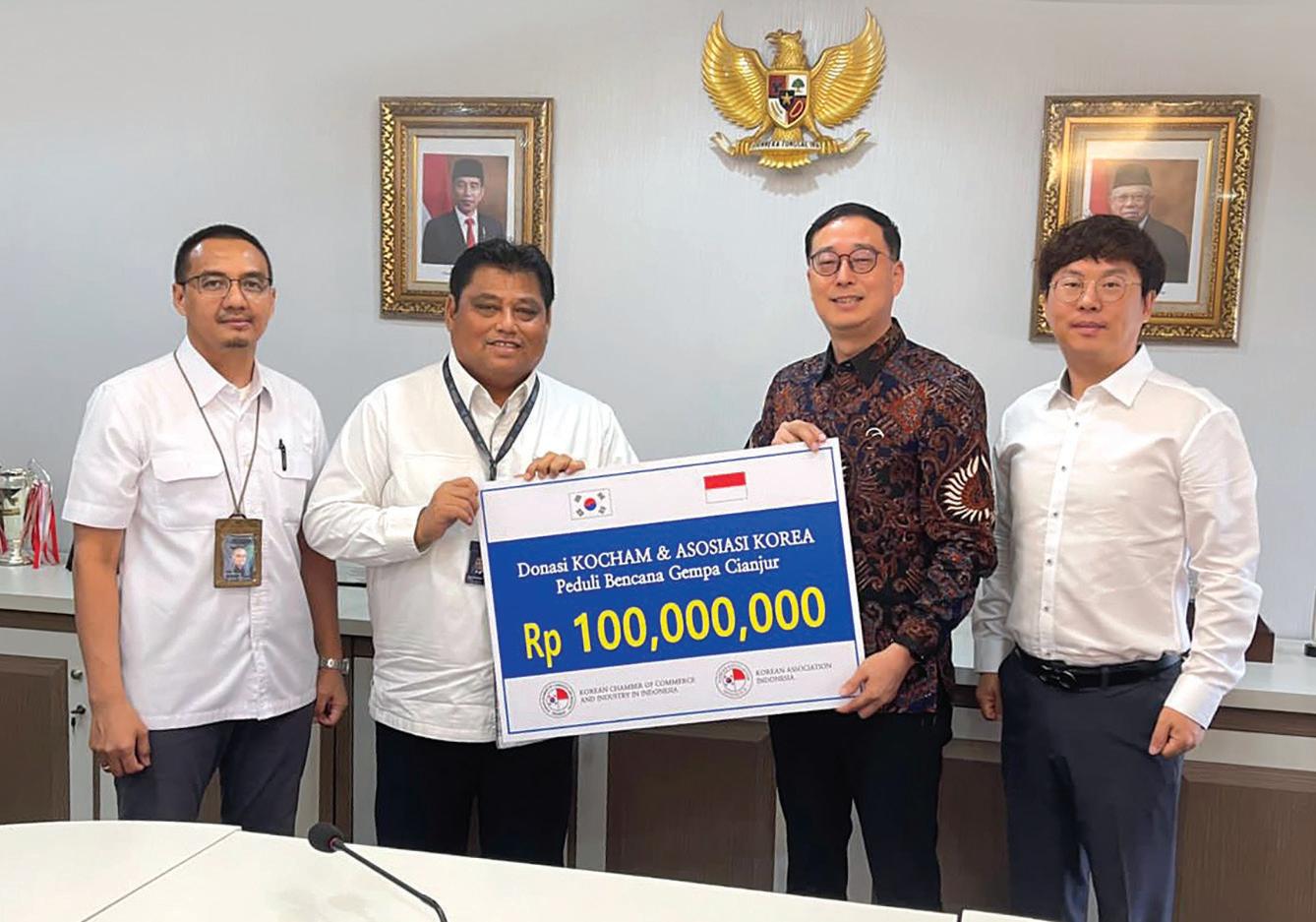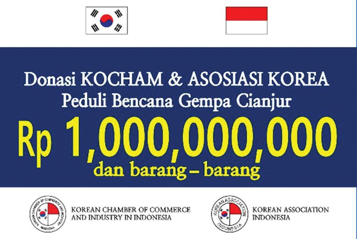지난 11월 21일, 서부 자바 찌안주르를 강타한 지진으로 11월 26일 기준 사망자가 310명, 실종자가 24명에 이른다. 아직도 여진과 악천우의 불안함 속에 힘들어하는 이재민들을 위해 재인니한인회(회장 박재한)와 코참(회장 이강현)은 다음날인 22일부터 28일까지 한인사회 를 대상으로 모금 활동을 벌였다. 이웃의 고통에 공감하고 위로를 전하는 한인들의 따듯한 손 길이 이어져 SK E&S 2억루피아, 삼성전자 인도네시아, LG전자 인도네시아, LX 인터내셔 널 인도네시아 각 1억루피아, 재인도네시아