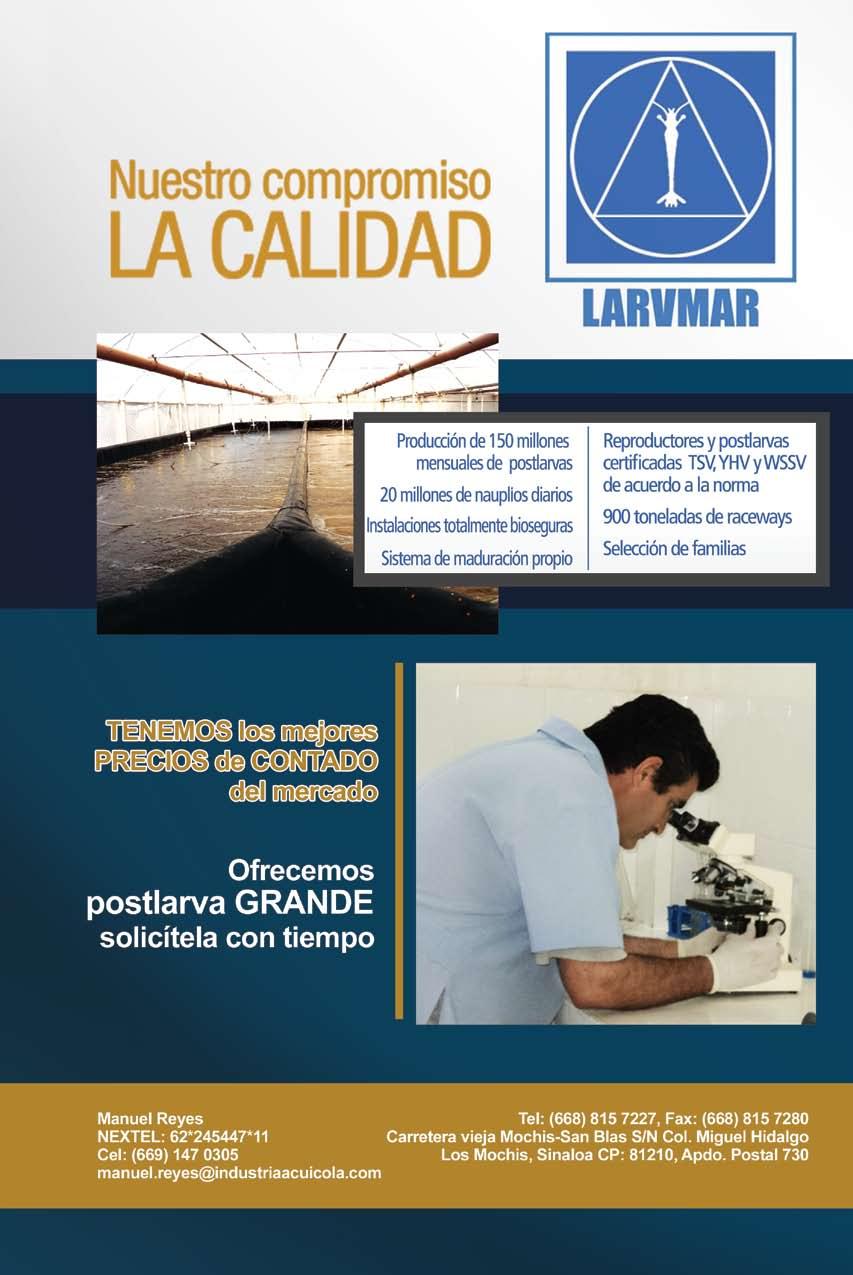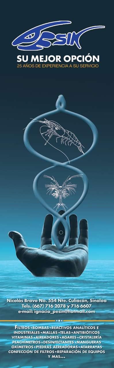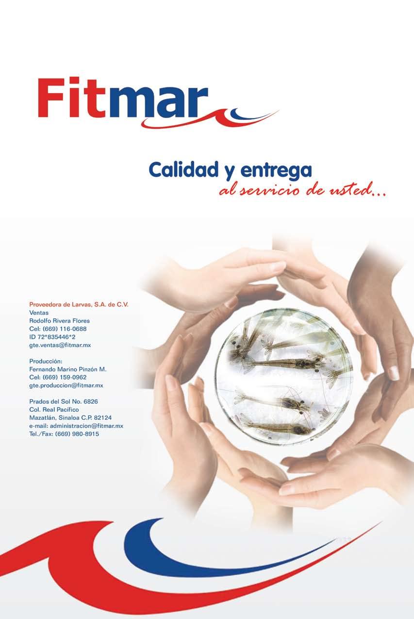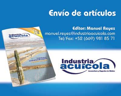 La publicidad y promociones de las marcas aquí anunciadas son responsabilidad de las propias empresas. La información, opinión y análisis de los artículos contenidos en esta publicación son responsabilidad de los autores y no refleja, necesariamente, el criterio de esta editorial. INDUSTRIA ACUÍCOLA, Revista bimestral, Marzo 2013. Editor responsable: Manuel de Jesús Reyes Fierro. Número de Certificado de Reserva otorgado por el Instituto Nacional del Derecho de Autor: 04-2007-100211233500. Número de Certificado de Licitud de Contenido: 11574 y número de Certificado de Licitud de Título: 14001, emitidos por la Secretaría de Gobernación. Registro Postal PP25-0003. Domicilio de la Publicación: De Las Torres No. 202, Col. José Gordillo Pinto C.P. 82136, Mazatlán Sinaloa, Mazatlán, Sinaloa. Impresión: Imprenta El Debate.