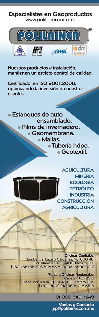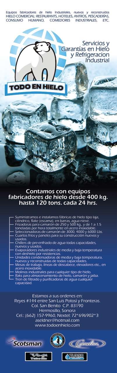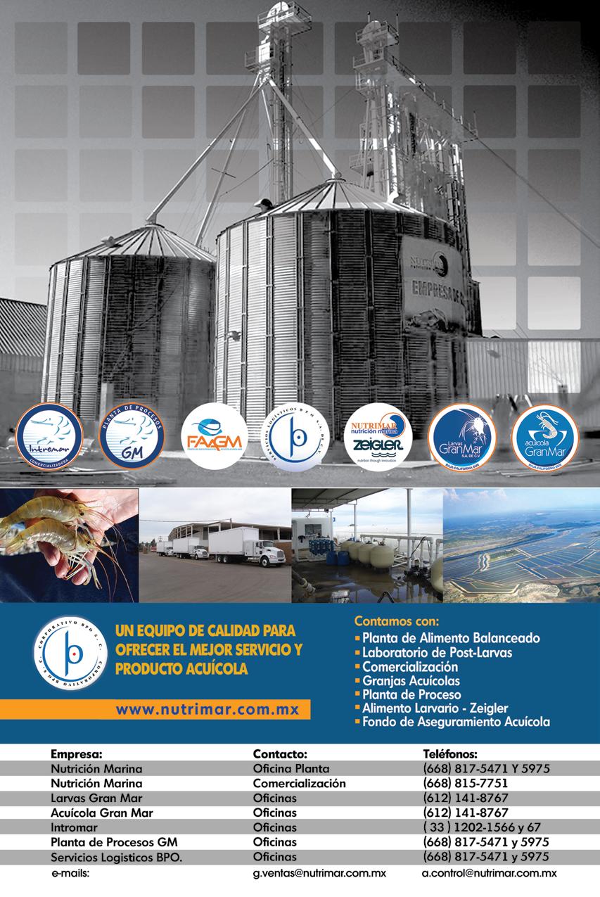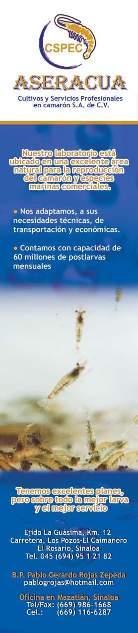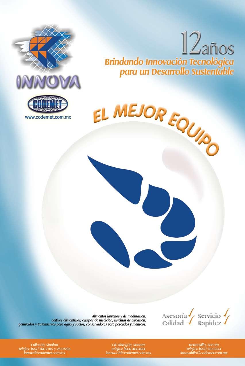 La publicidad y promociones de las marcas aquí anunciadas son responsabilidad de las propias empresas. La información, opinión y análisis de los artículos contenidos en esta publicación son responsabilidad de los autores y no refleja, necesariamente, el criterio de esta editorial. INDUSTRIA ACUÍCOLA, Revista bimestral, Marzo 2013. Editor responsable: Manuel de Jesús Reyes Fierro. Número de Certificado de Reserva otorgado por el Instituto Nacional del Derecho de Autor: 04-2007-100211233500. Número de Certificado de Licitud de Contenido: 11574 y número de Certificado de Licitud de Título: 14001, emitidos por la Secretaría de Gobernación. Registro Postal PP25-0003. Domicilio de la Publicación: De Las Torres No. 202, Col. José Gordillo Pinto C.P. 82136, Mazatlán Sinaloa, Mazatlán, Sinaloa. Impresión: Imprenta El Debate.