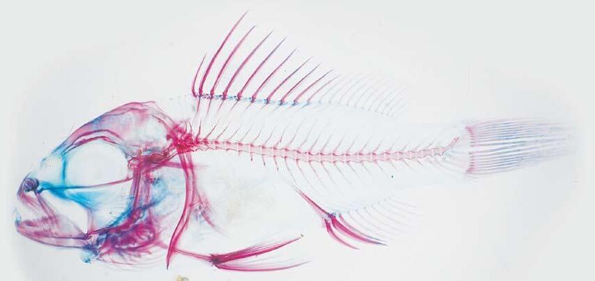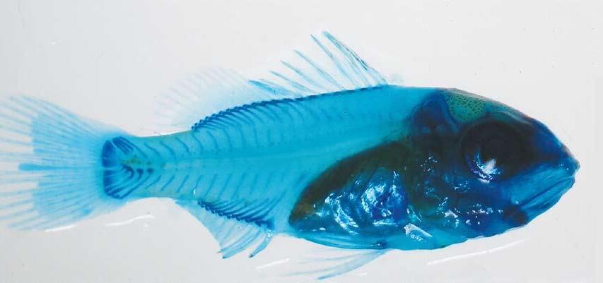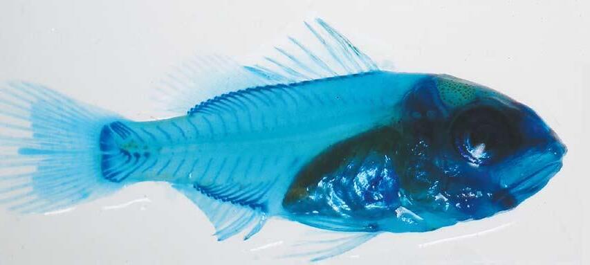 El método más generalizado para poder detectar deformaciones esqueléticas en larvas de peces es, el basado en la tinción selectiva en tejidos óseos y cartilaginosos por colorantes específicos como el rojo de alizarina y el azul aciano. El primero tiñe la matriz mineralizada del hueso, mientras que el segundo colorea los condrocitos y matriz cartilaginosa (Figs. 1 y 2).