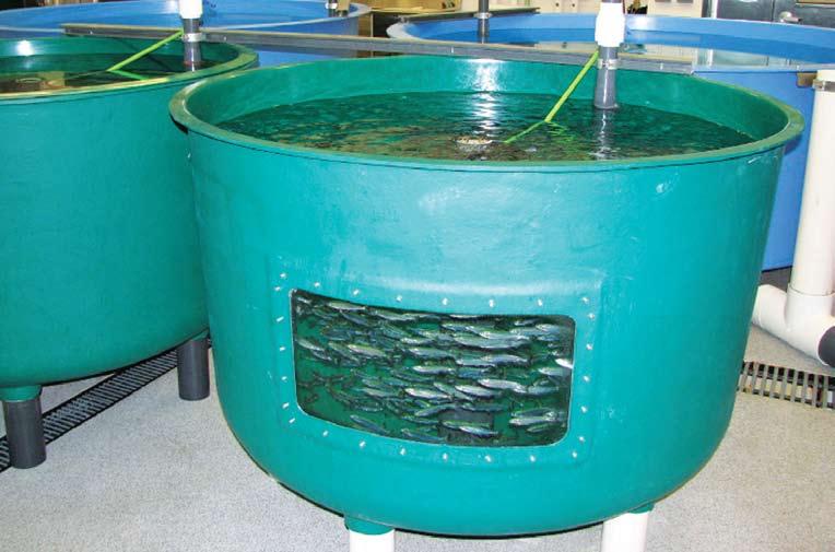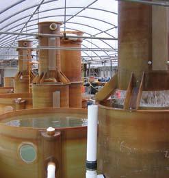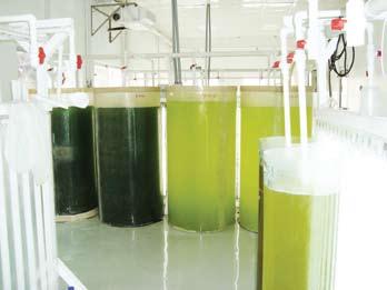 Las especies de microalgas cultivadas en el CIAD son Nannochloropsis oculata, Isochrysis sp. y Chaetoceros muelleri, su cultivo se realiza por medio de inóculos sucesivos desde cepas hasta garrafón de 20 l, con el medio “f/2”, para volúmenes mayores (de columnas de 80 l, 700 l (fig. 2) hasta tanques de 7000 l) se utilizan nutrientes agrícolas.