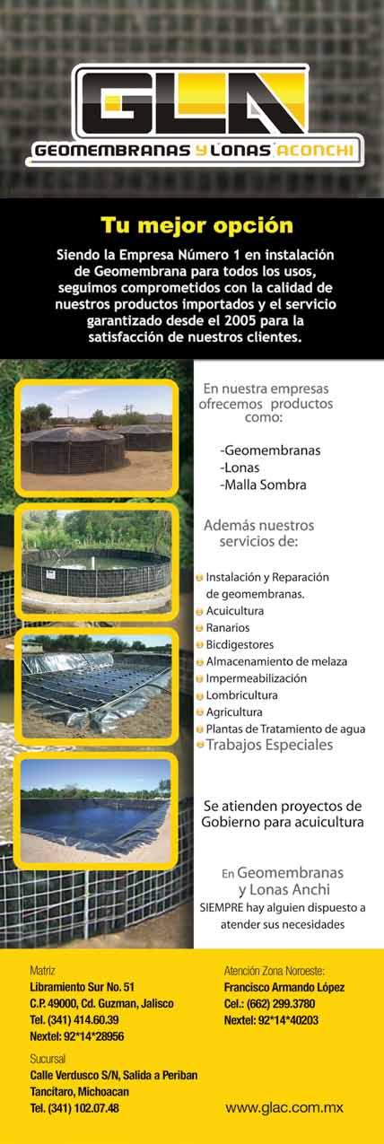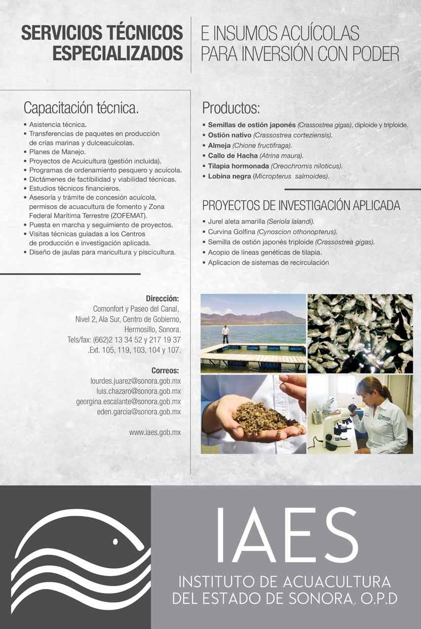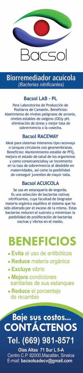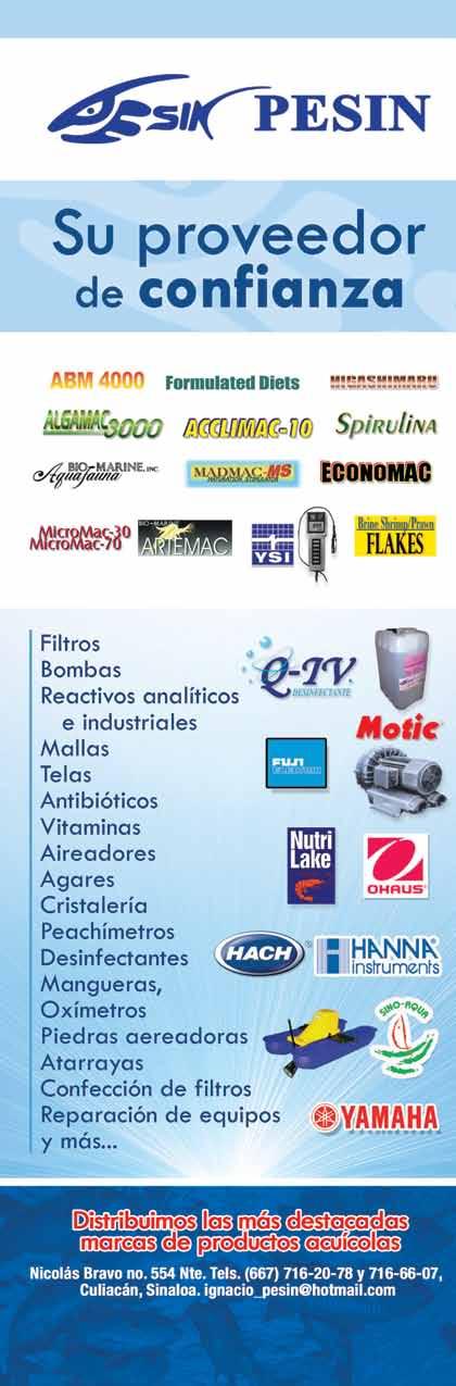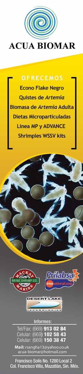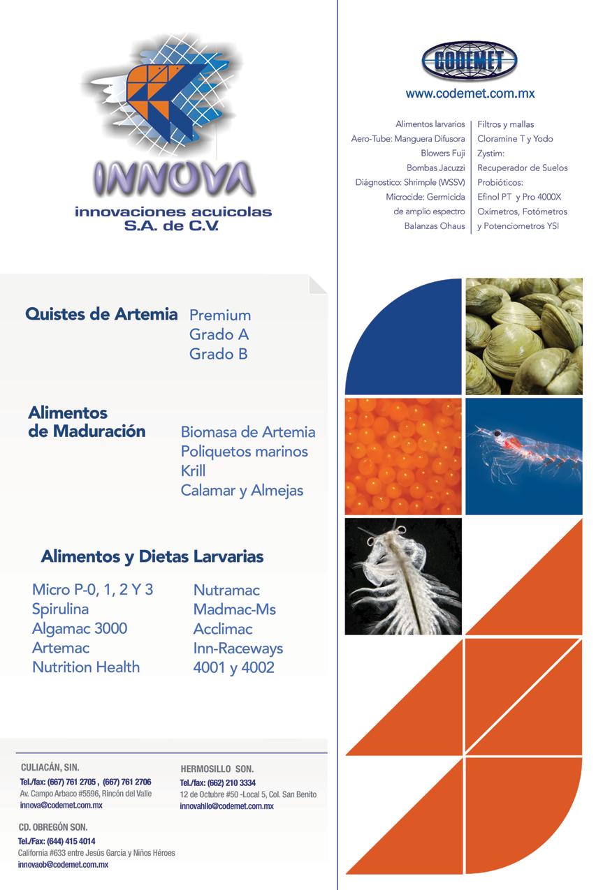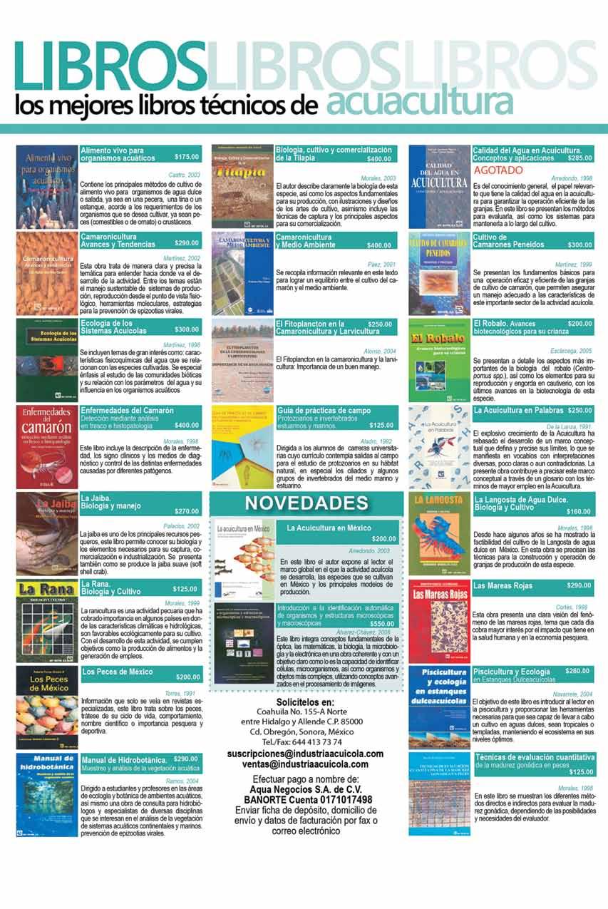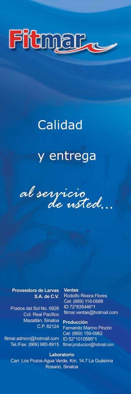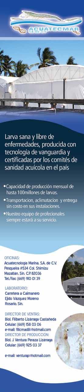 La publicidad y promociones de las marcas aquí anunciadas son responsabilidad de las propias empresas. La información, opinión y análisis de los análisis contenidos en esta publicación son responsabilidad de los autores y no refleja, necesariamente, el criterio de esta editorial. INDUSTRIA ACUÍCOLA, Revista bimestral, julio 2010. Editor responsable: Manuel de Jesús Reyes Fierro. Número de Certificado de Reserva otorgado por el Instituto Nacional del Derecho de Autor: 04-2007-100211233500. Número de Certifi-cado de Licitud de Contenido: 11574 y número de Certificado de Licitud de Título: 14001, emitidos por la Secretaría de Gobernación. Registro Postal PP26-0017. Domicilio de la Publicación: Olas Altas Sur 71 Int. 5-A, Centro 82000, Mazatlán, Sinaloa. Impresión: Imprenta El Debate.