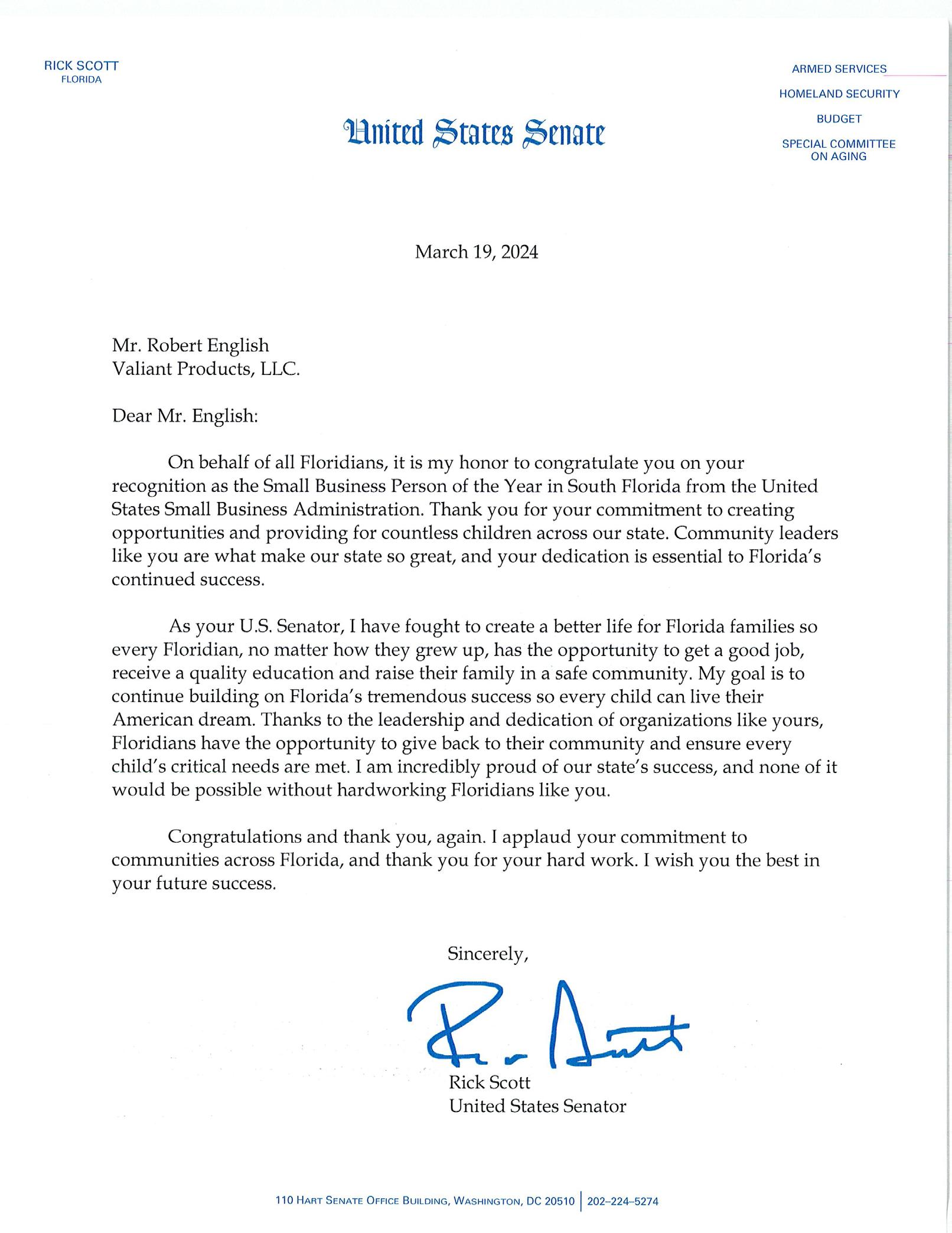 On behalf of all Floridians, it is my honor to con gratulate you on your recognition as the Small Business Person of the Year in South Florida from the United States Small Business Adminis tration. Thank you for your commitment to cre ating opportunities and providing for countless children across our state. Community leaders like you are what make our state so great, and your dedication is essential to Florida’s continued success.