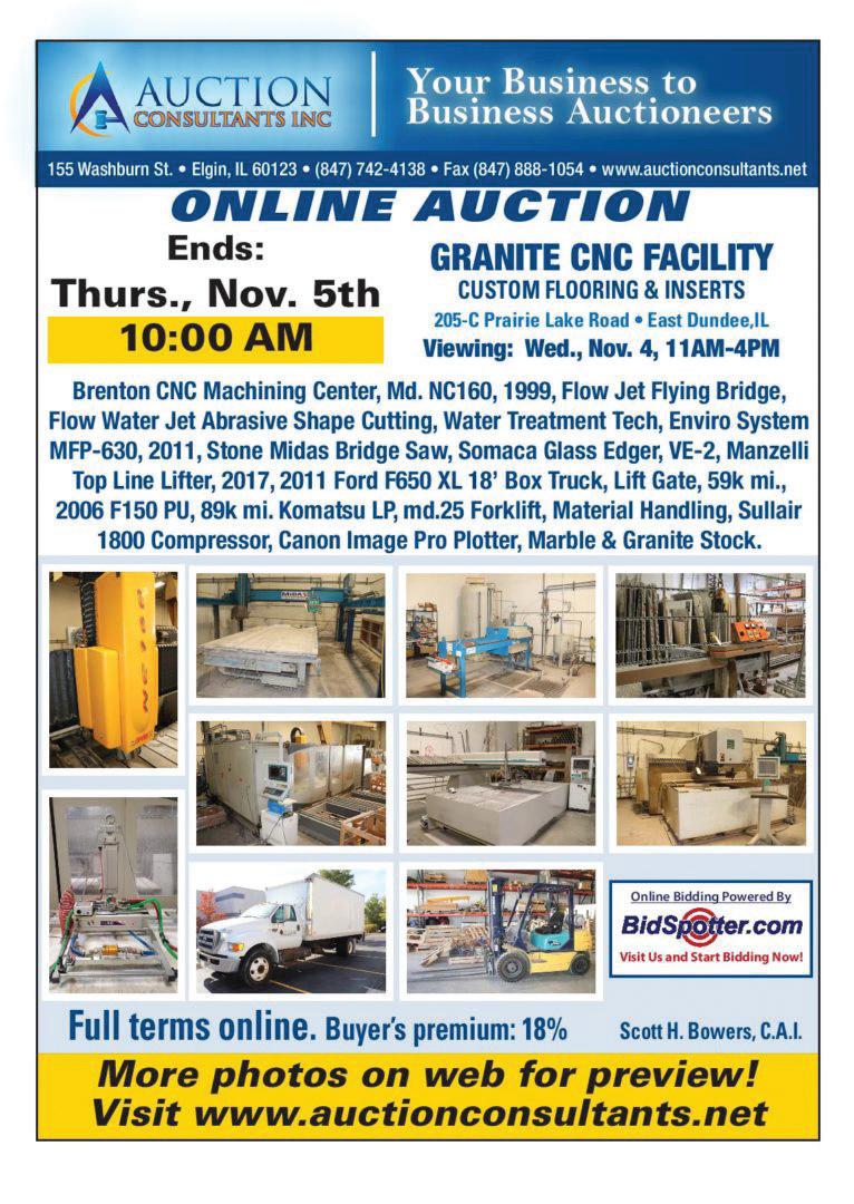 Mechanical Contracting Tools & Equipment ASSETS FROM MAJOR POWER GENERATION FIELD SERVICES COMPANY 2647 Morgan Lane in Hamilton, OH WEBCAST AUCTION - NO ON-SITE BIDDING THURSDAY, JUNE 27 at 9AM ET INSPECTION: Day Prior to Auction from 9AM to 4PM Featuring: (10+) Shipping Containers • VIDMAR & LYON Cabinets • Large Quantity of ENERPAC Hydraulic Power Packs & Rams • (5) Forklifts • Wire Baskets • MILLER Welders • Job Boxes • Carts • Inspection Equipment Including: Micrometers • Calipers (513) 738-3311 | MyronBowling.com FOR MORE INFORMATION ABOUT EQUIPMENT, CONTACT LOGAN OLIVER, (513) 828-9080, Logan@MyronBowling.com 18% BP with Bidspotter.com | Ohio Auction License - Tom C. Bowling License: #2006000081, Myron Bowling Auctioneers: #63198514949 Automotive & vehicles (115) Agricultural equipment (32) Food & beverage equipment (11) (2)-DAY BRISTOL TRANSPORT, INC. & BEAR EQUIPMENT AUCTION (847) 742-4138 • Fax (847) 888-1054 • www.auctionconsultants.net 4915 DIVISION ST., MELROSE PARK, IL 60160 PICKUP: JUNE 19TH THROUGH JUNE 25TH BY APPOINTMENT MAKE AN APPOINTMENT @ HTTPS://CALENDLY.COM/AUCTIONCONSULTANTS/PICKUP Visit Us and Start Bidding Now! Visit Us and Start Bidding Now! 1108-1/2 N. 9th Ave., Walla Walla, WA LIVE AUCTION ONLY ROB MOREL, OWNER - RETIRING FROM BUSINESS 509-520-1035 • 509-527-3715 Fax: 509-529-5606 www.maconbrosauction.com AUCTION BEGINS CLOSING: JUNE 14, 2024-10AM COMPLETE ONLINE LIQUIDATION AUCTION INTRI-CUT MACHINING PLASTIC INJECTION MACHINES: Engel ES240/80; BOY 25D; Boy 22M; Boy 15S; Toshiba IS-80A.