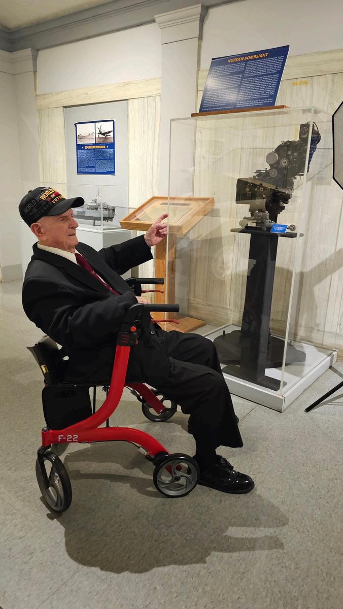 BobPedigopointstotheIndiana-madeNordenBombsighton displayattheIndianaWarMemorialmuseuminIndianapolis,IN. NexttothebombsightitistheLukas-HaroldOldTimersplaque Bobdonatedtothemuseum.Bobisthelastlivingsurvivorofthe 500machinistsengravedontheplaque