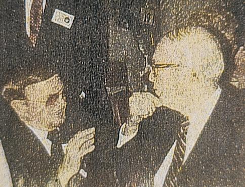 Bob and his 453rd Bombardment Group Briefing Officer, Brig Gen Jimmy Stewart (famous American actor) have an intense discussion at one of their 8th Air Force Reunions.