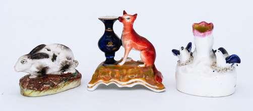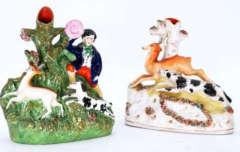 A Staffordshire Pottery Group Spill Vase, modelled as a Hunter with his Dogs, a captured hare below, 23.5cm high. 010 £20 - £40