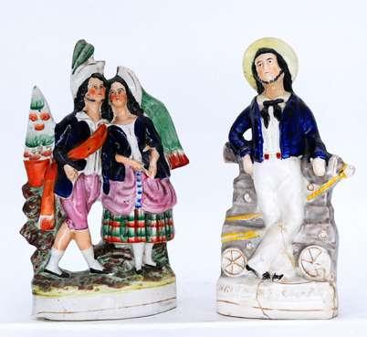 Three Staffordshire Pottery Flatbacks, including The Corsair, a theatrical figure based on a poem by Byron, standing posed with a turban, 20cm high; also Two Scottish Fishwives, 21cm high; and Princess Alice and Louis of Hesse, 20cm high (3).
