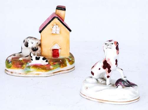 Three Staffordshire Pottery Flatback Figurines, including Goat Girl; and Lady with her Spaniels, and a Highland Dancer, the goatherdess seated with a billy goat, 21cm high; the lady with two spaniels beside a kennel, 22cm; the dancer, beside his guitar, 26cm (3).