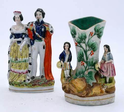 Two Staffordshire Pottery Flatback Figures, including a Group, possibly The Maid of Athens and Byron, or two unpublished Opera stars, 23.5cm high; also a spill base with Romantic Couple, 17.5cm high (2).