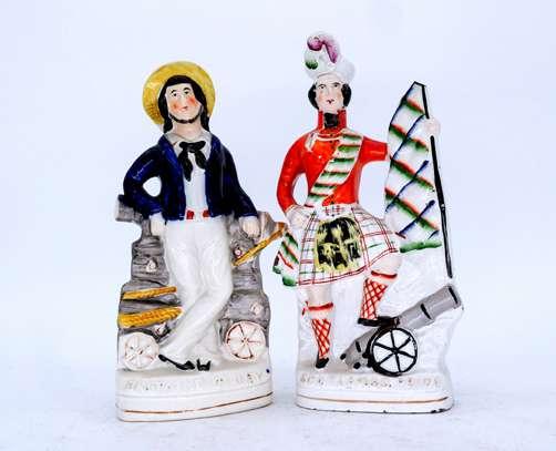 The Staffordshire Potters were a large group of both small and large firms producing volumes of decorative figures to cheer up the lamp lit interiors of 19th century Britain. At the basic level most are made by hand forcing clay into three moulds. A back, front and base. These moulds could be quickly re-purposed, and the output painted up so multiple different people or scenes could be created cheaply and quickly. The masses loved them as the variety was eclectic, affordable and easily incorporated into the often chaotic interiors beloved by Victorians.