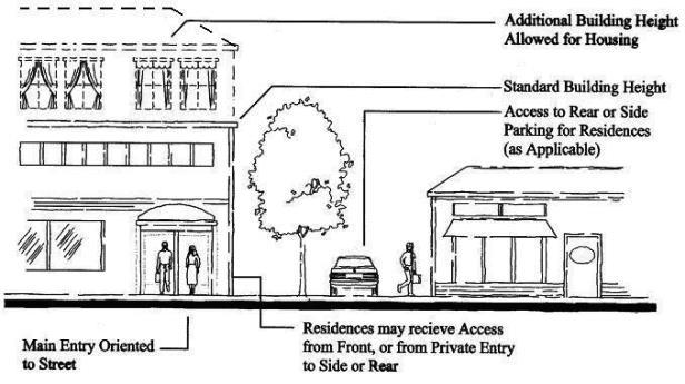 • Courtyard/Plaza Option. Embellish the pedestrian zone by creating accessible courtyards/plazas as extension of the sidewalk (the public realm). Incorporate pedestrian amenities such as street trees, outdoor seating, display areas, public art, human-scale lighting and decorative pavers.