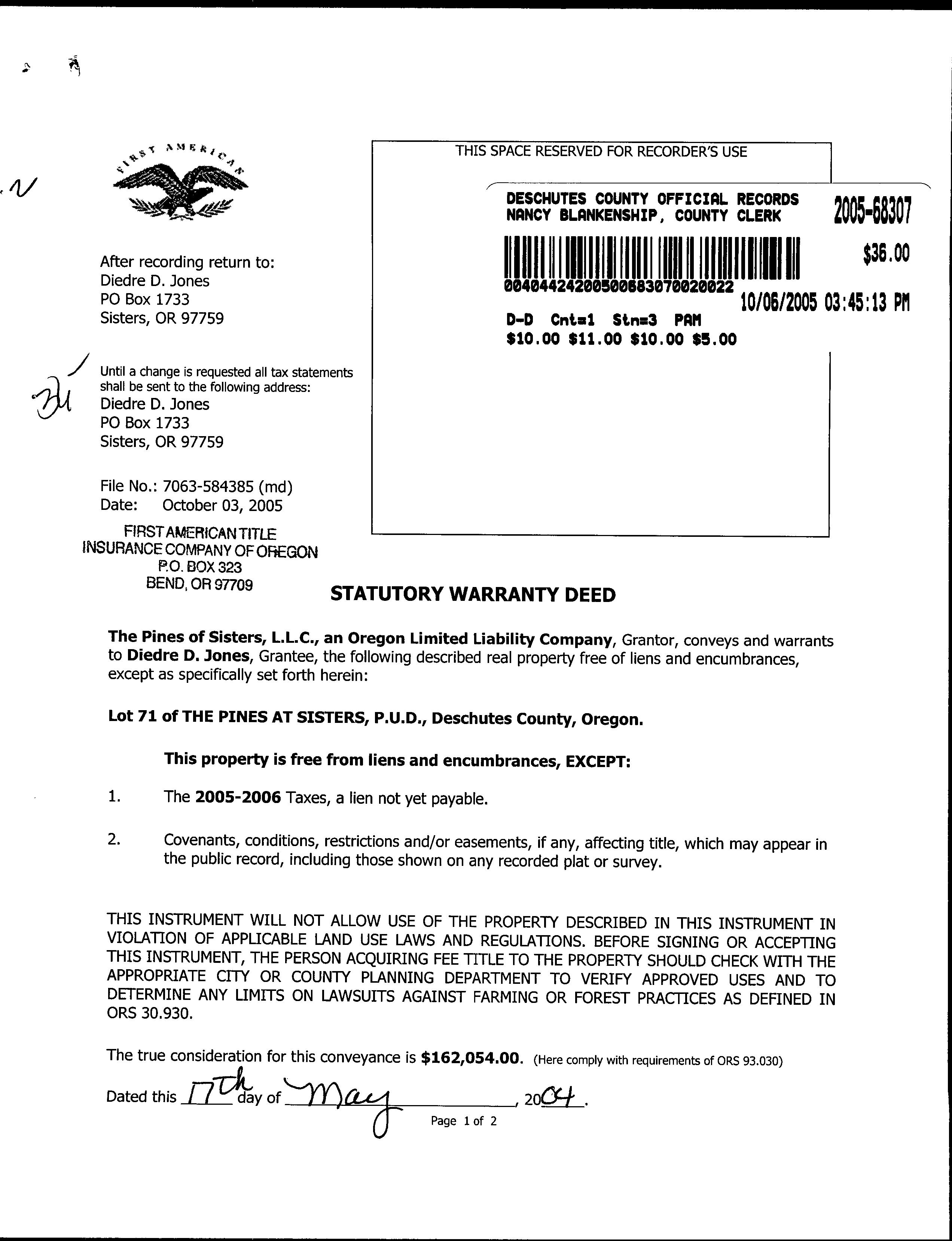 Deschutes County Title has provided this information as a courtesy and assumes no liability for the accuracy of the data and does not warranty the fitness of this product for any particular purpose. 1059 W Yapoah Crater Dr|Sisters|Oregon|97759 Bend 397 SW Upper Terrace Dr Bend, Oregon 97702 Office: 541.389.2120 Fax: 541.389.2180 Redmond 845 SW Veterans Way Redmond, Oregon 97756 Office: 541.527.1274 Fax: 541.527.1281 La Pine 51515 Huntington Rd La Pine, Oregon 97739 Office: 541.876.6990 Fax: 541.876.2740 St Helens 240 South First Street St. Helens, Oregon 97051 Office: 503.397.2587 Fax: 503.366.1708 HOMEBOOK www.deschutestitle.com