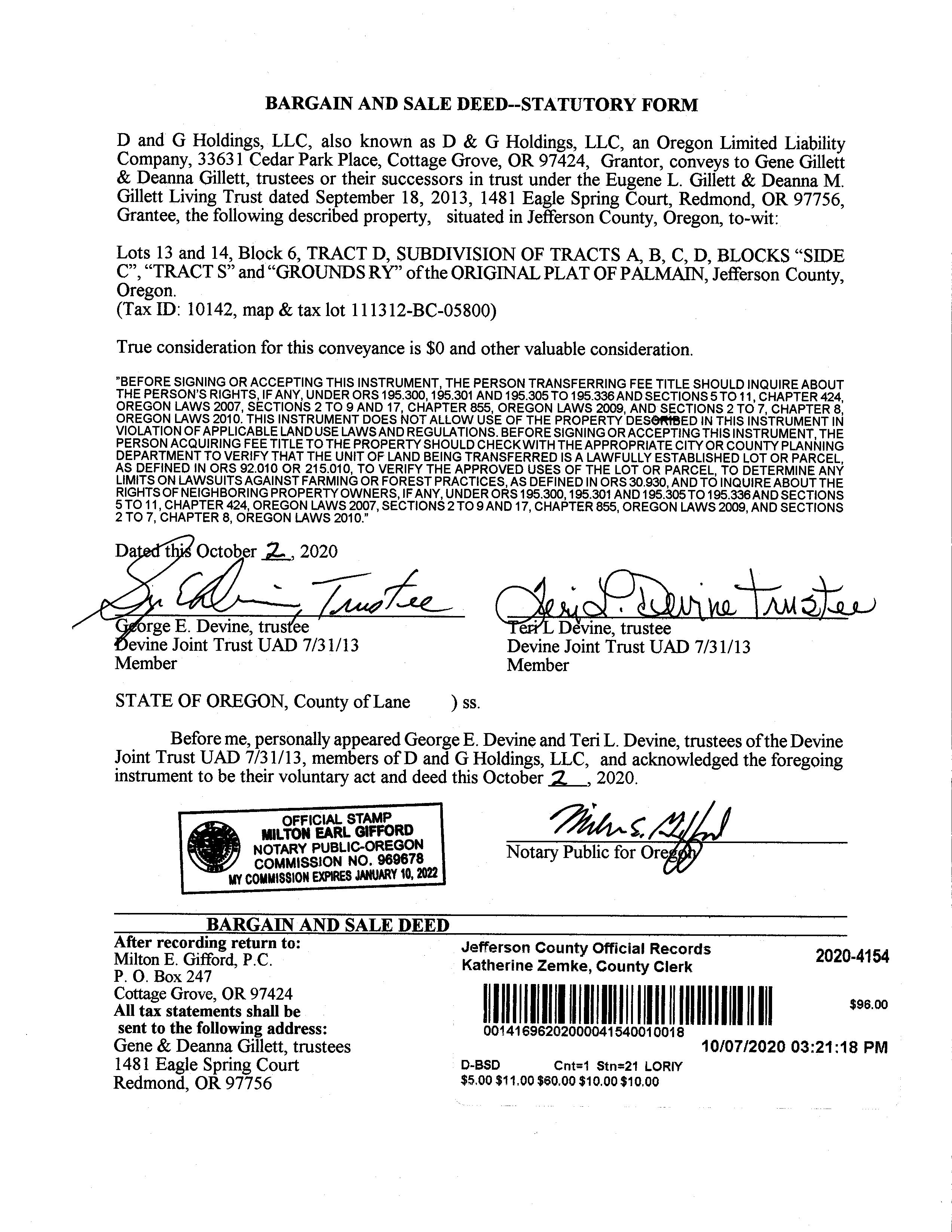 GILLETT EUGENE L. & DEANNA M. LIVING TRT GILLETT, GENE & DEANNA, TRUSTEES 1481 EAGLE SPRINGS CT REDMOND OR 97756-7390