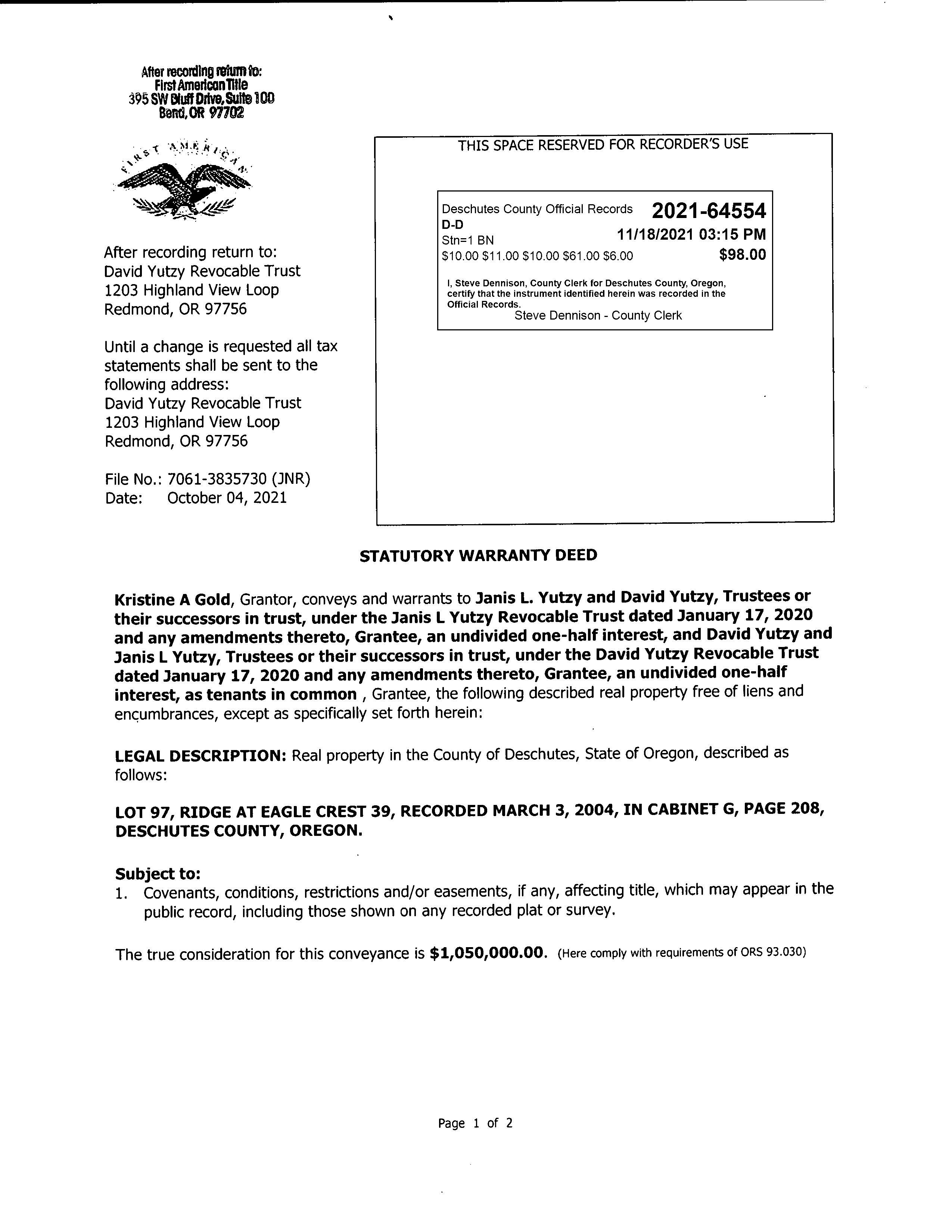 OWNER JANIS L YUTZY REVOCABLE TRUST, OWNER