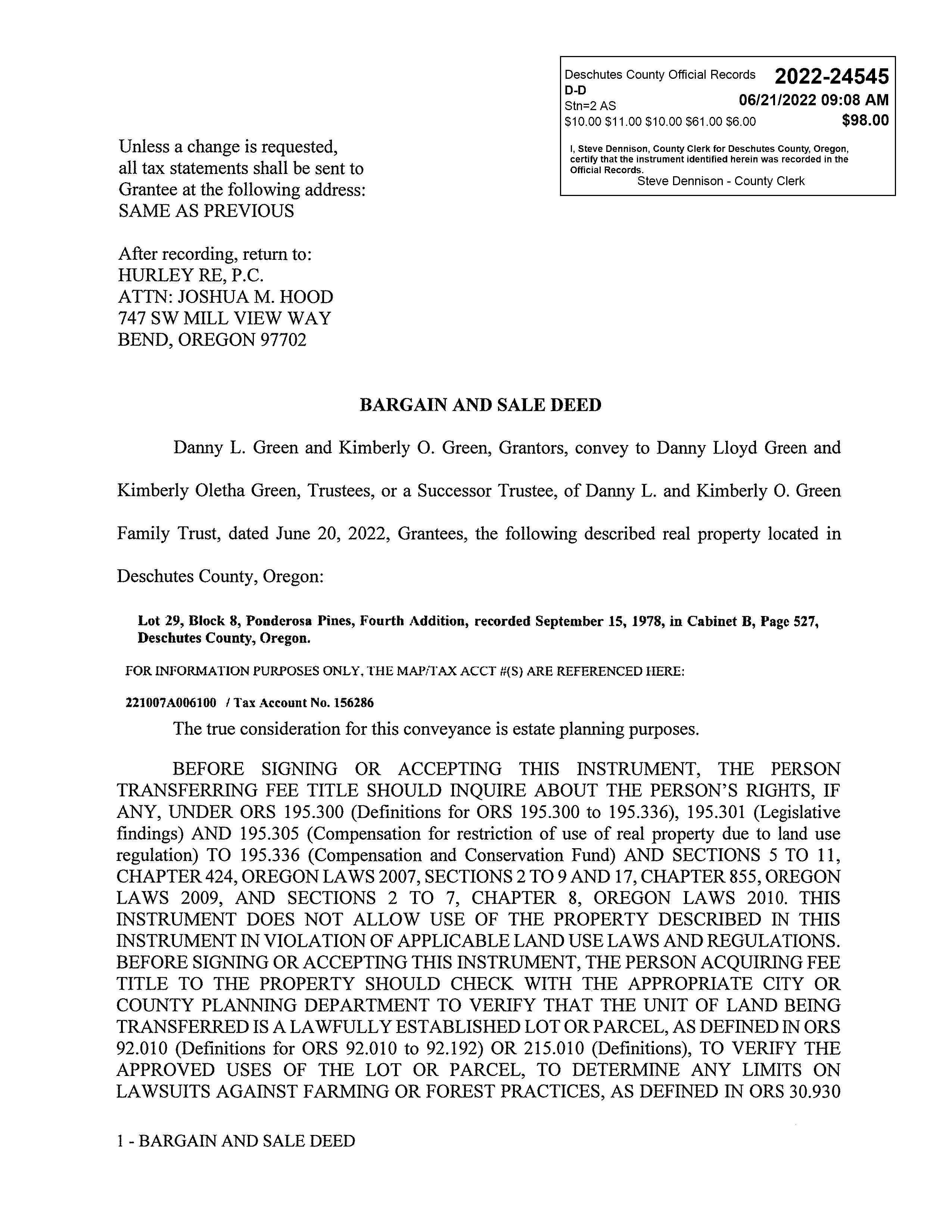 Review of digital records maintained by the Deschutes County Assessor’s Office, Tax Office, Finance Office, and the Community Development Department indicates that there are County tax, assessment, or property development related notations associated with this account and that have been identified above. Independent verification of the presence of additional Deschutes County tax, assessment, development, and other property related considerations is recommended. Confirmation is commonly provided by title companies, real estate agents, developers, engineering and surveying firms, and other parties who are involved in property transactions or property development. In addition, County departments may be contacted directly to discuss the information.