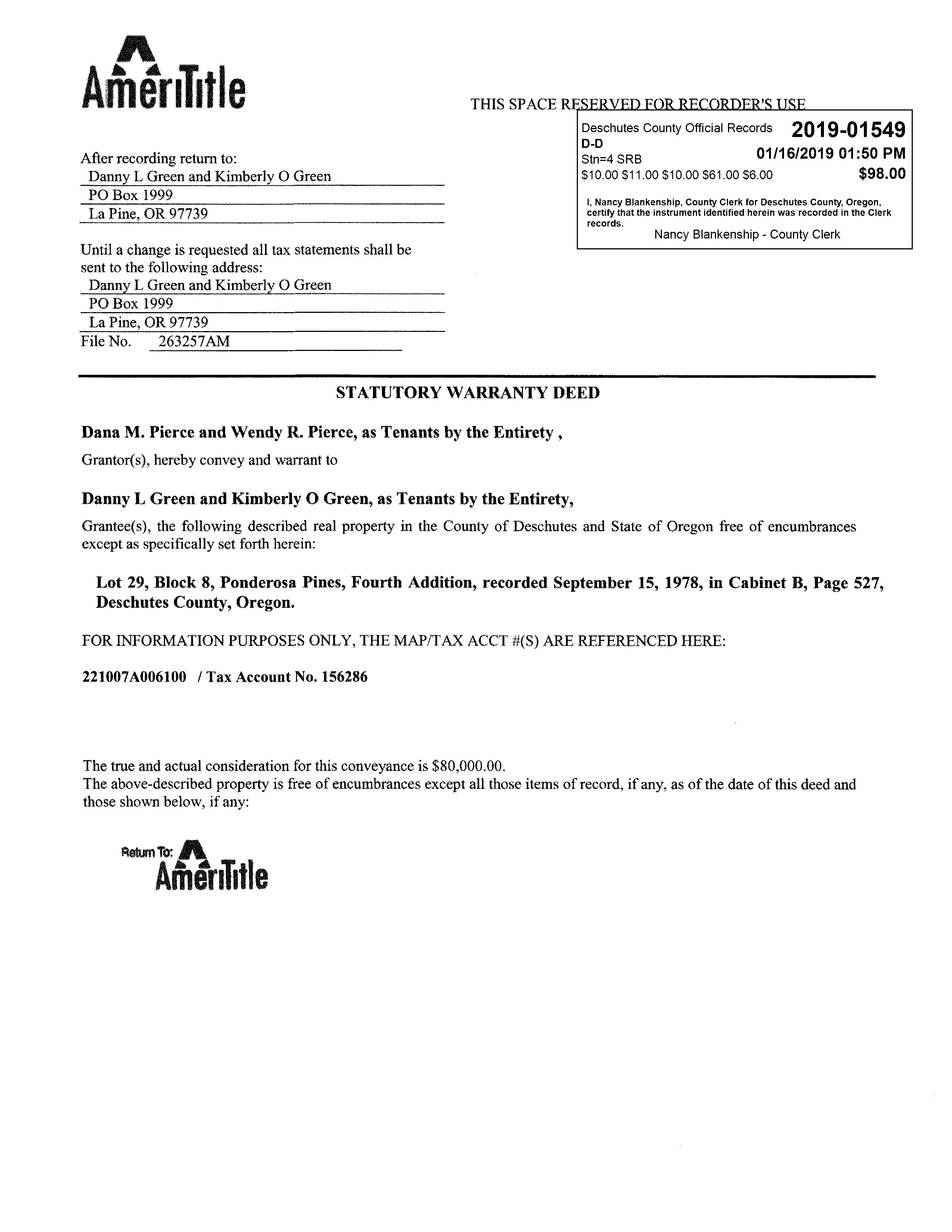 WATER TAX DISTRICT PONDEROSA PINES WATER COMPANY (541) 536-9125 53275 PONDEROSA WAY, LA PINE, OR 97739