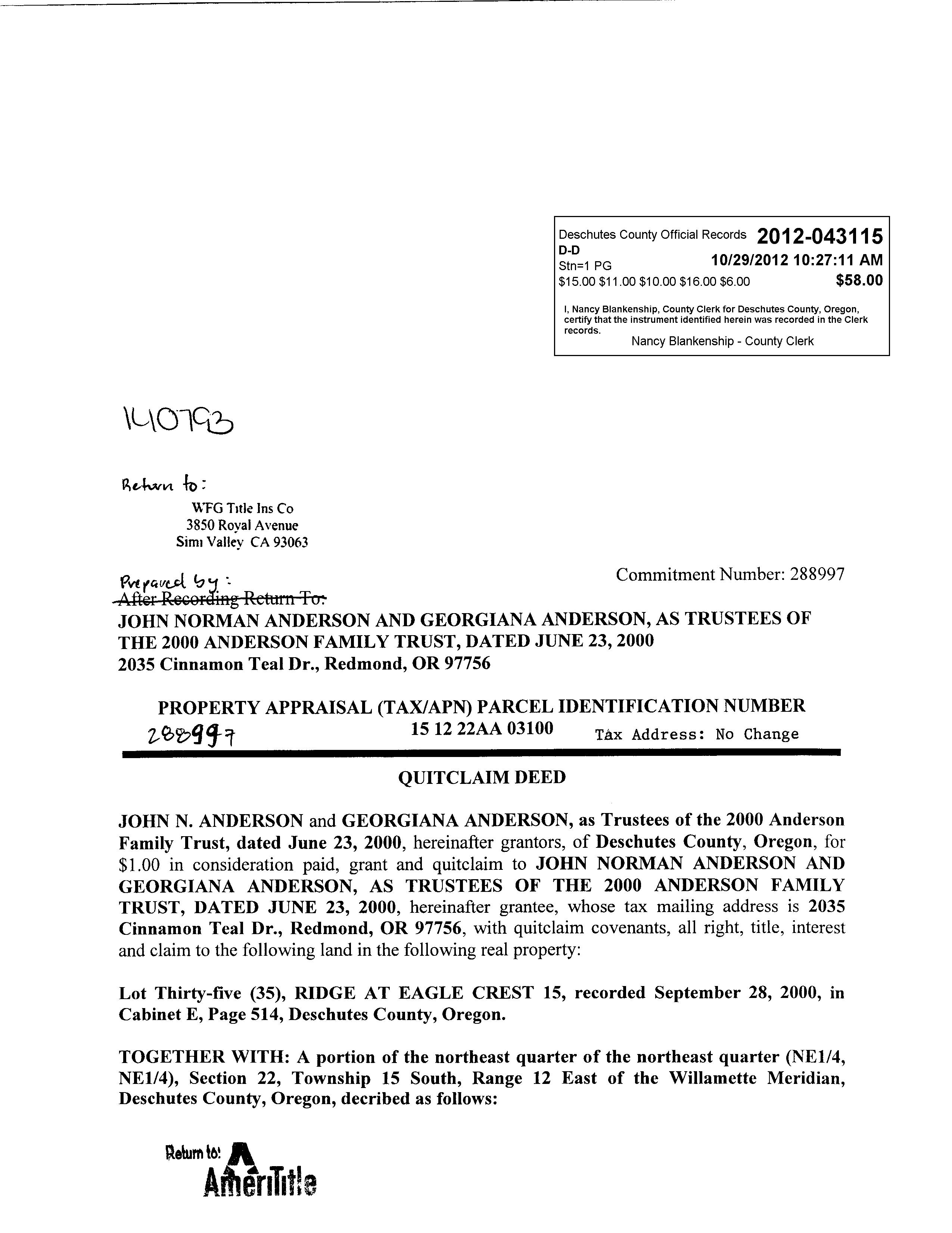 Review of digital records maintained by the Deschutes County Assessor’s Office, Tax Office, Finance Office, and the Community Development Department indicates that there are no special tax, assessment or property development related notations associated with this account. However, independent verification of the presence of other Deschutes County tax, assessment, development, and additional property related considerations is recommended. Confirmation is commonly provided by title companies, real estate agents, developers, engineering and surveying firms, and other parties who are involved in property transactions or property development. In addition, County departments may be contacted directly to discuss the information.