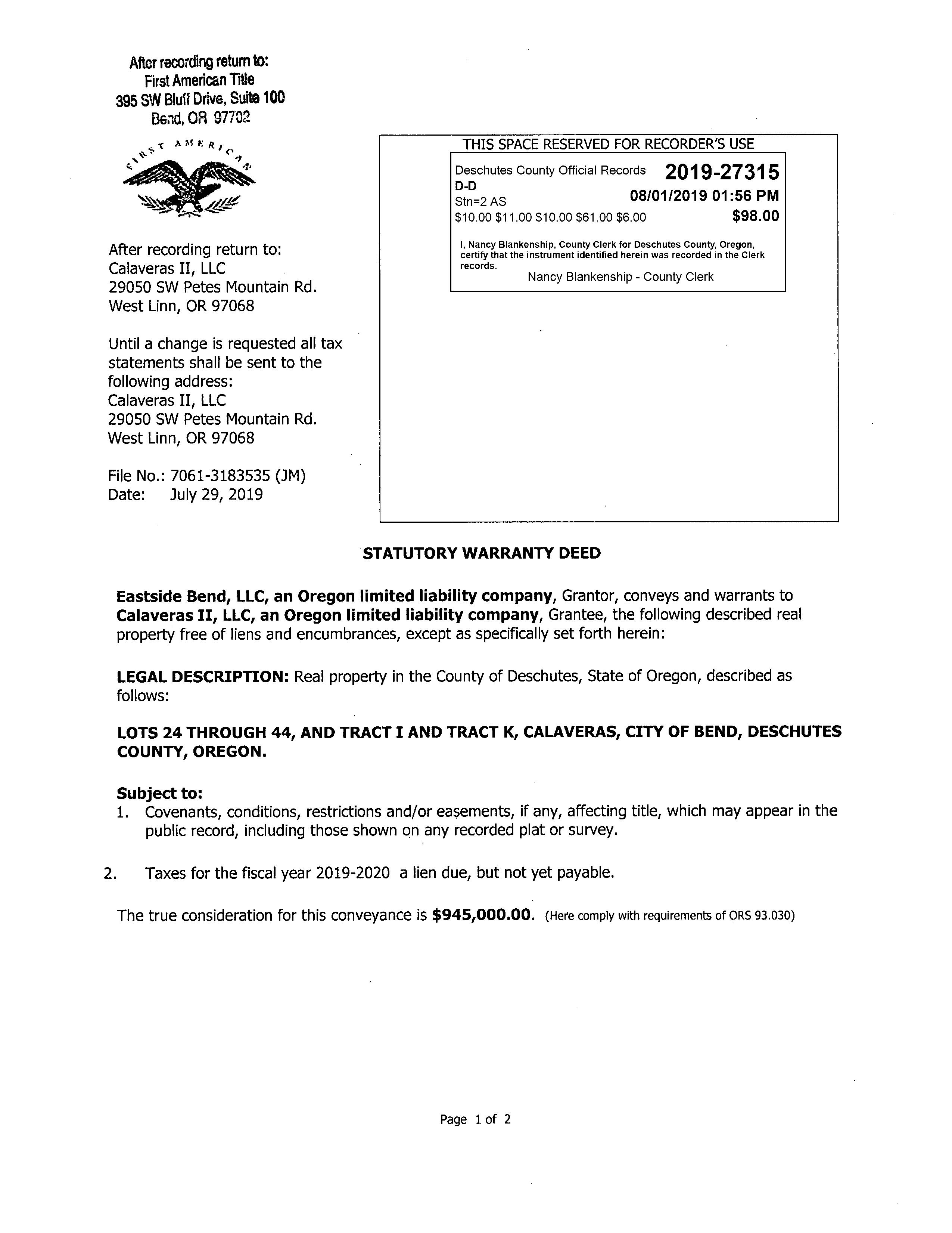 20536 Empire Ave|Bend|Oregon|97701 Deschutes County Title has provided this information as a courtesy and assumes no liability for the accuracy of the data and does not warranty the fitness of this product for any particular purpose. Bend 397 SW Upper Terrace Dr Bend, Oregon 97702 Office: 541.389.2120 Fax: 541.389.2180 Redmond 845 SW Veterans Way Redmond, Oregon 97756 Office: 541.527.1274 Fax: 541.527.1281 La Pine 51515 Huntington Rd La Pine, Oregon 97739 Office: 541.876.6990 Fax: 541.876.2740 St Helens 240 South First Street St. Helens, Oregon 97051 Office: 503.397.2587 Fax: 503.366.1708 HOMEBOOK www.deschutestitle.com