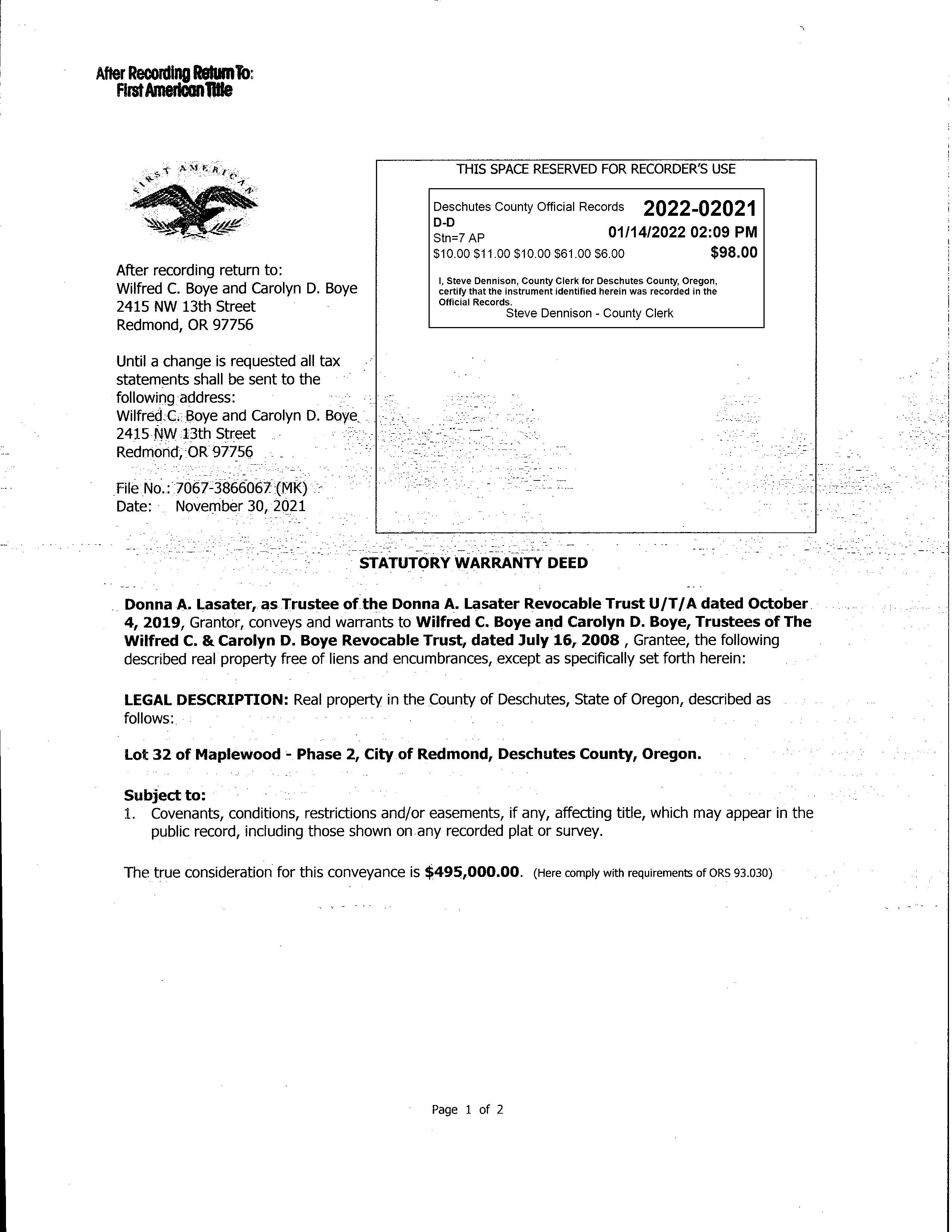 OWNER Wilfred C & Carolyn D Boye Rev Trust