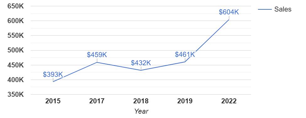 Year # SalesPrice/SqFtPrice/FinSqFt % Turnover AvgSale Price MinSale Price MaxSale Price 2015 1 $120 $120 10 $393,000 $393,000 $393,000 2017 1 $201 $201 10 $459,000 $459,000 $459,000 2018 2 $144 $144 20 $432,000 $415,000 $449,000 2019 1 $138 $138 10 $460,500 $460,500 $460,500 2022 1 $343 $343 10 $604,000 $604,000 $604,000