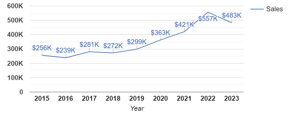 Year # SalesPrice/SqFtPrice/FinSqFt % Turnover AvgSale Price MinSale Price MaxSale Price 2015 3 $170 $170 2 $255,800 $224,900 $304,500 2016 5 $178 $178 4 $238,800 $220,000 $260,000 2017 7 $211 $211 5 $280,914 $249,000 $331,500 2018 8 $188 $188 6 $272,490 $97,920 $349,000 2019 6 $263 $263 4 $298,667 $289,500 $325,000 2020 8 $261 $261 6 $362,863 $290,000 $450,000 2021 7 $318 $318 5 $412,143 $200,000 $465,000 2022 10 $433 $433 7 $549,150 $421,500 $680,000 2023 3 $347 $347 2 $482,833 $440,000 $518,500
