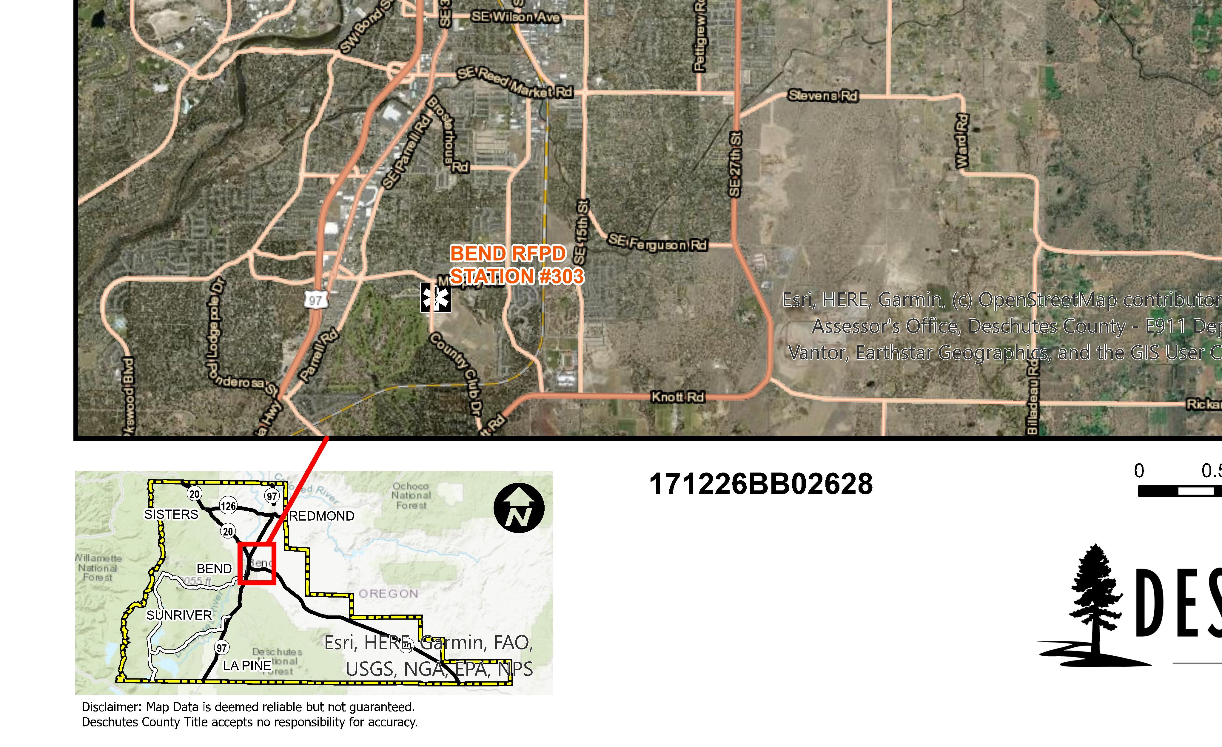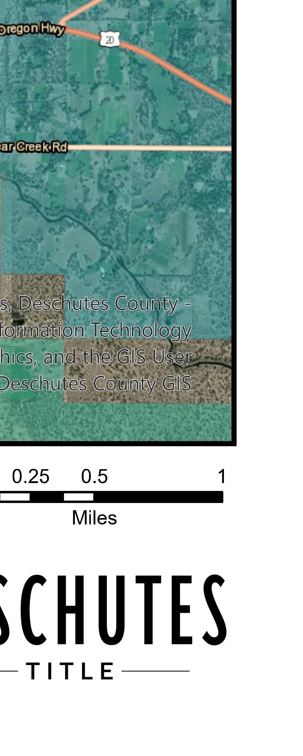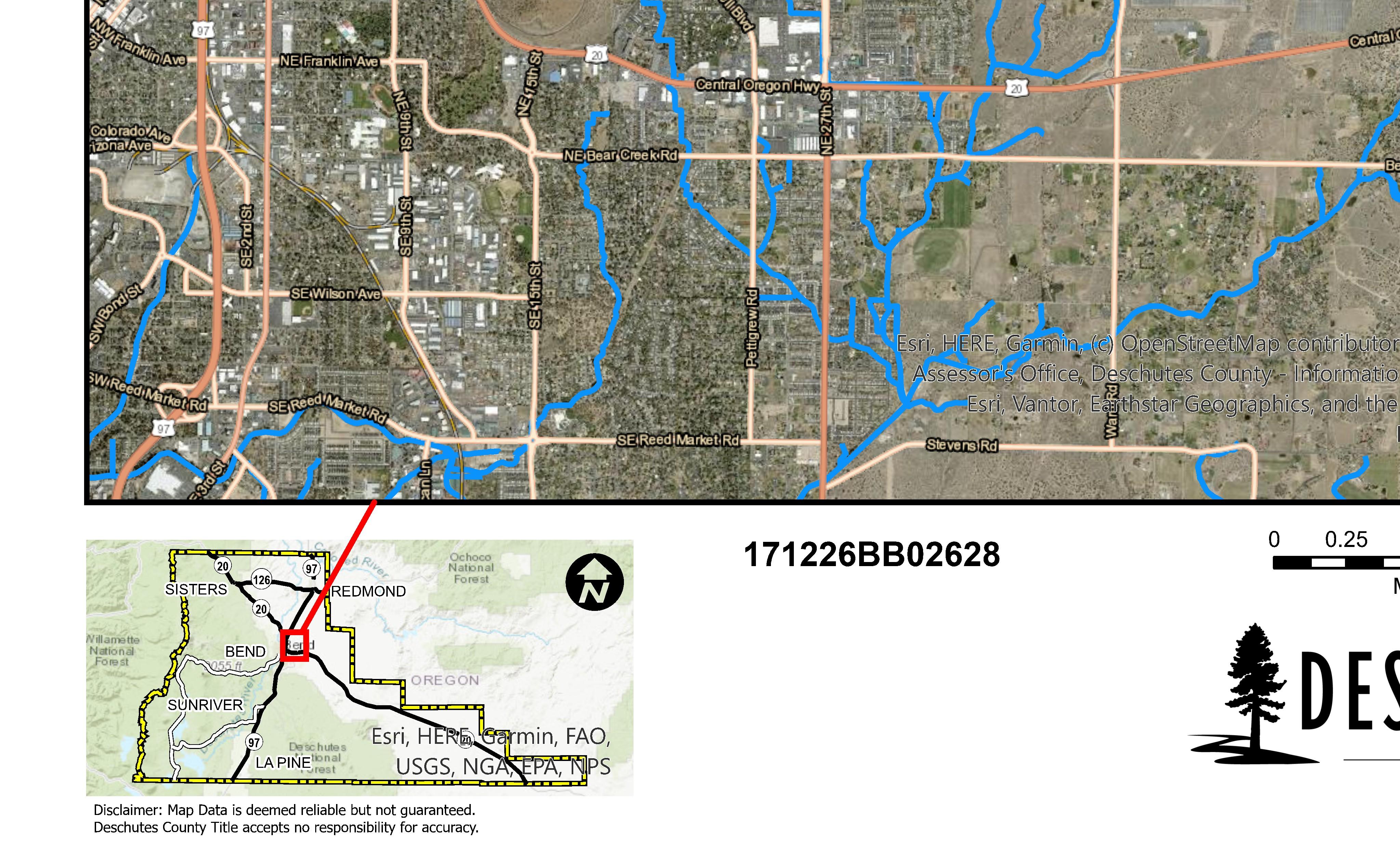 The information and maps presented in this report are provided for your convenience. Every reasonable effort has been made to assure the accuracy of the data and associated maps. Deschutes County makes no warranty, representation or guarantee as to the content, sequence, accuracy, timeliness or completeness of any of the data provided herein. Deschutes County explicitly disclaims any representations and warranties, including, without limitation, the implied warranties of merchantability and fitness for a particular purpose. Deschutes County shall assume no liability for any errors, omissions, or inaccuracies in the information provided regardless of how caused. Deschutes County assumes no liability for any decisions made or actions taken or not taken by the user of this information or data furnished hereunder.