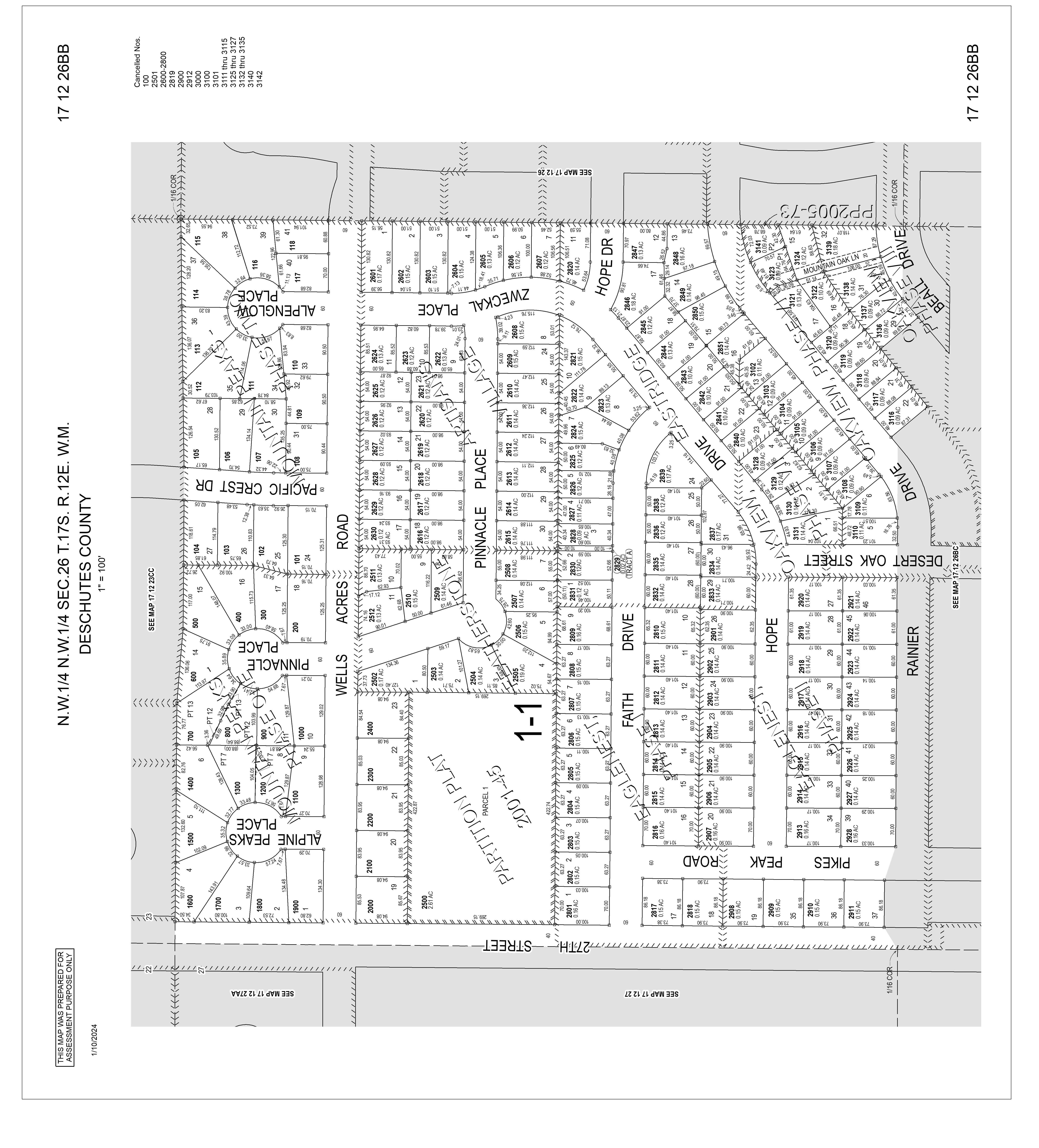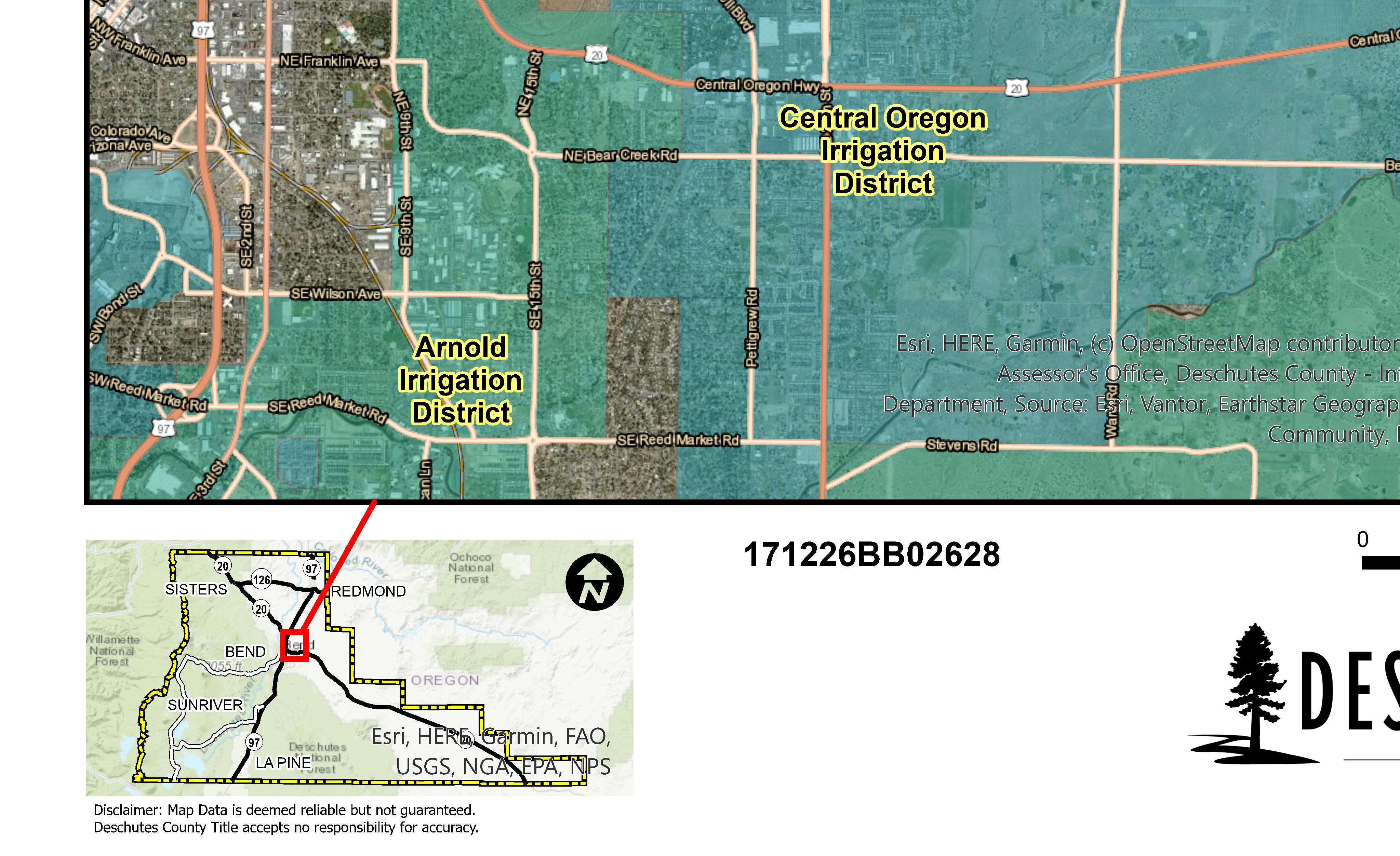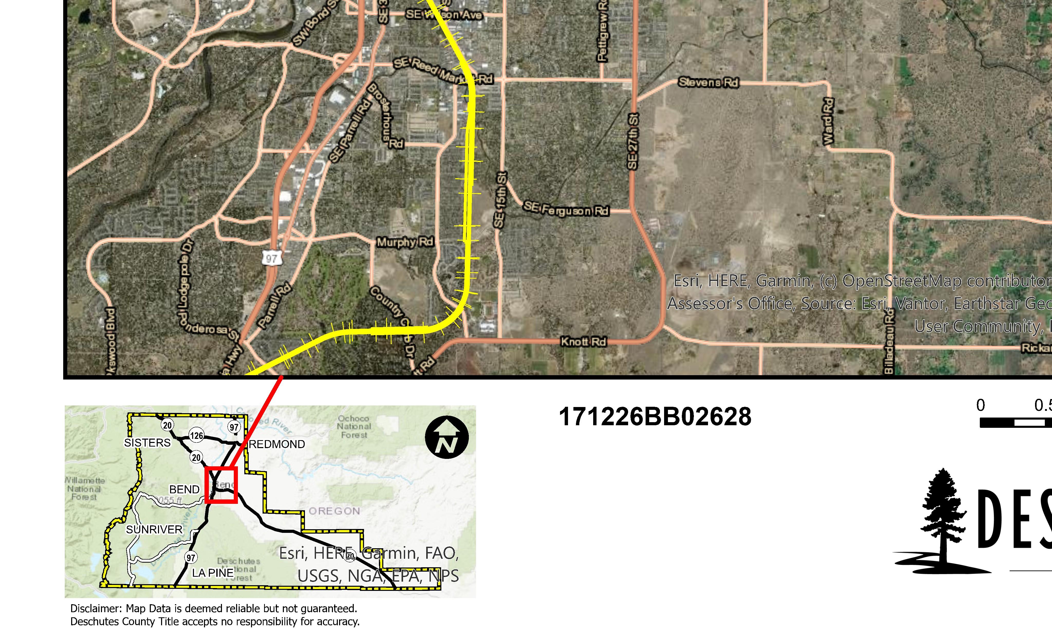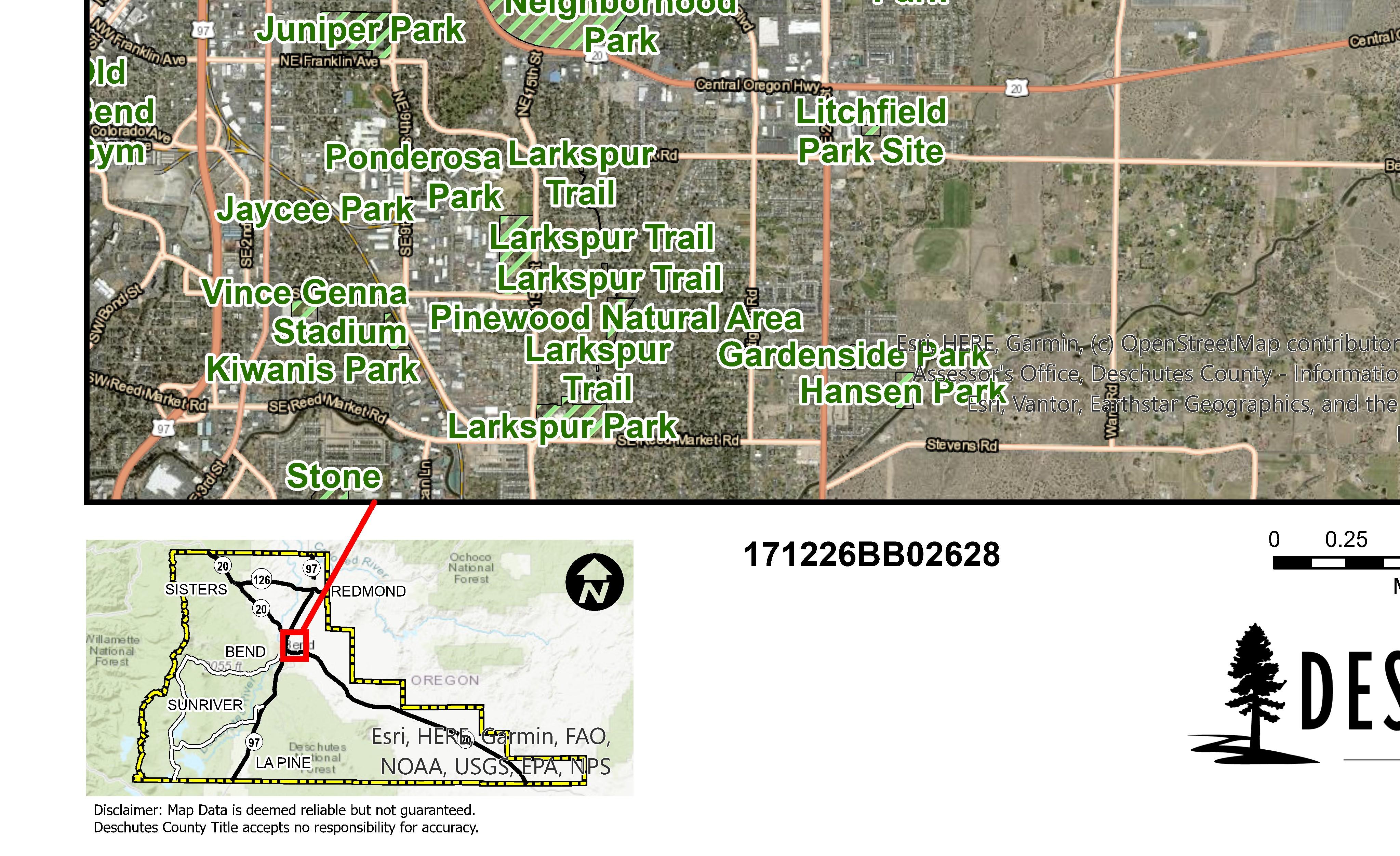 The information and maps presented in this report are provided for your convenience. Every reasonable effort has been made to assure the accuracy of the data and associated maps. Deschutes County makes no warranty, representation or guarantee as to the content, sequence, accuracy, timeliness or completeness of any of the data provided herein. Deschutes County explicitly disclaims any representations and warranties, including, without limitation, the implied warranties of merchantability and fitness for a particular purpose. Deschutes County shall assume no liability for any errors, omissions, or inaccuracies in the information provided regardless of how caused. Deschutes County assumes no liability for any decisions made or actions taken or not taken by the user of this information or data furnished hereunder.