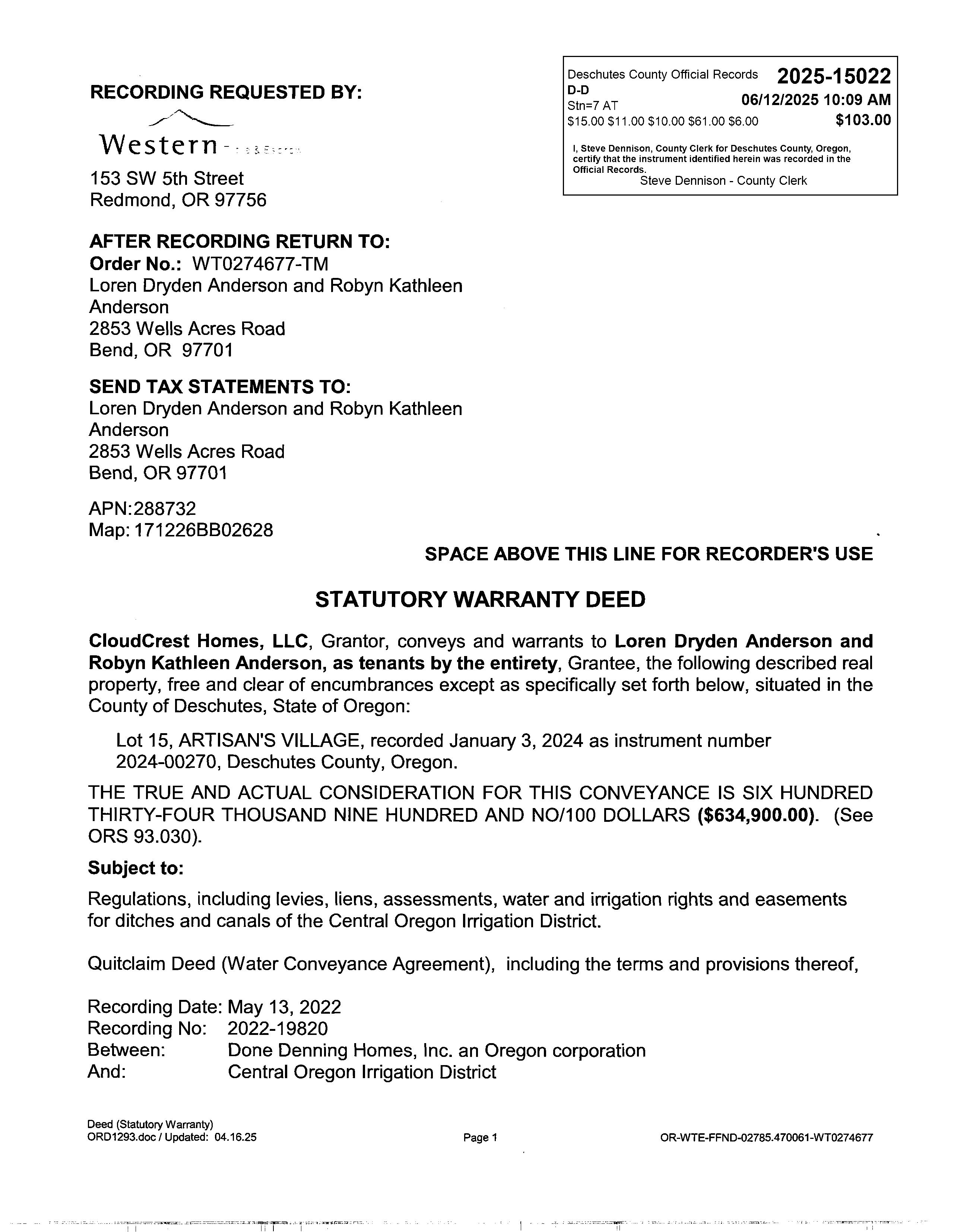 ANDERSON, LOREN DRYDEN & ROBYN KATHLEEN 2853 WELLS ACRES RD BEND OR 97701