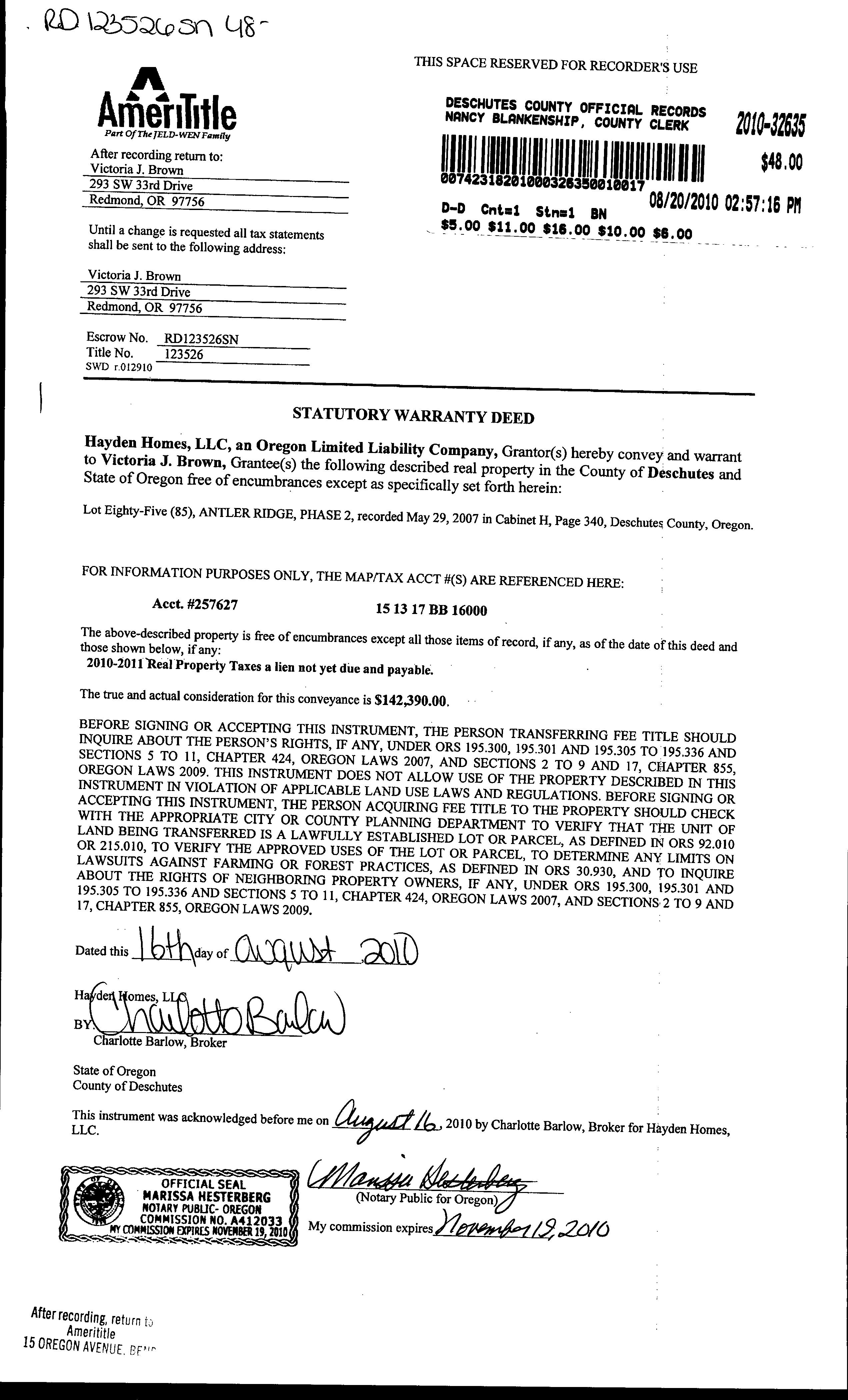 SUBJECTPROPERTY 257627 DeschutesCounty ADDRESS 293SW33rdDr Redmond,OR97756 OWNER VictoriaJBrownTrust DATE 11/28/2022 PREPAREDBY DanettaRider danettar@deschutestitle.com