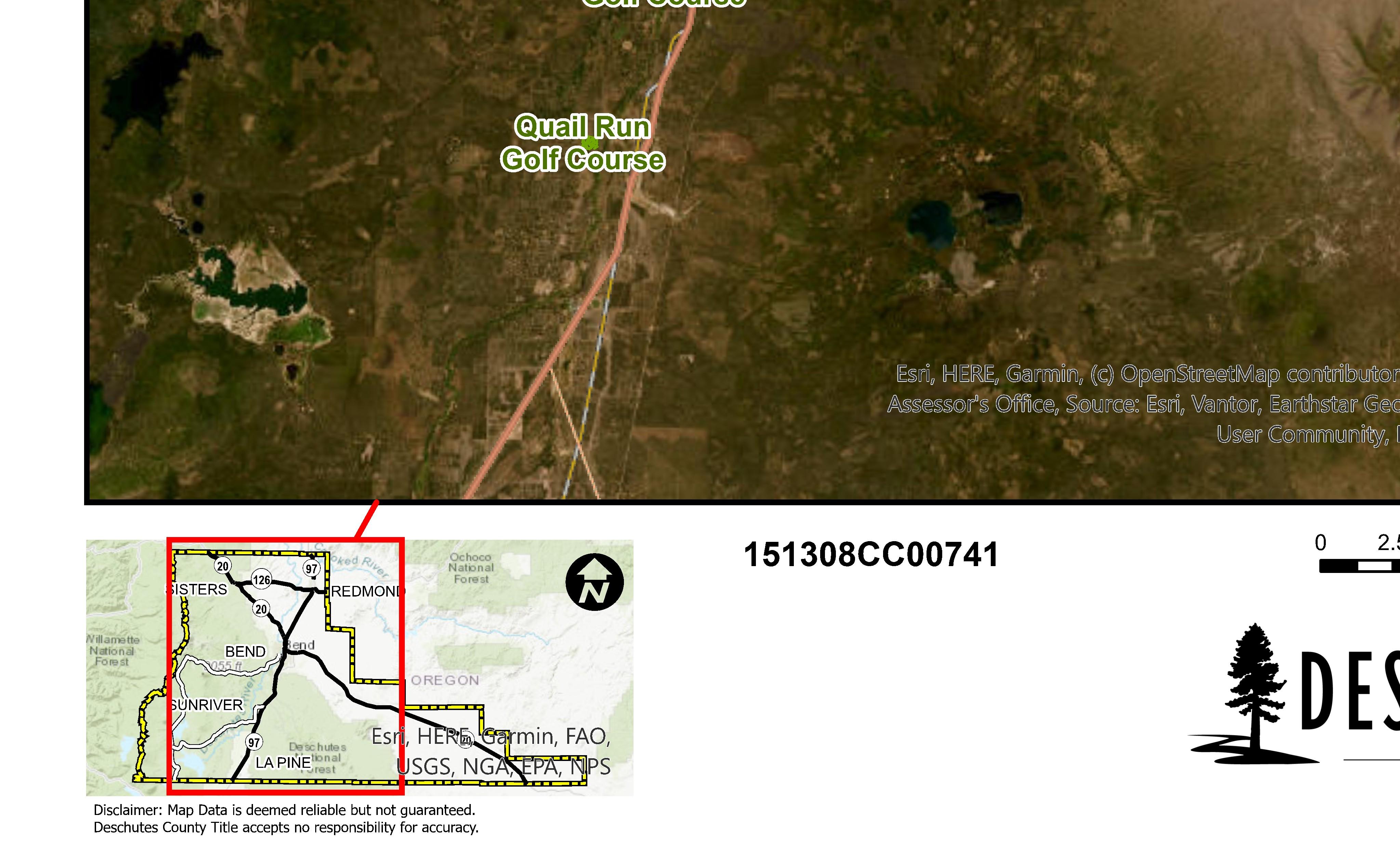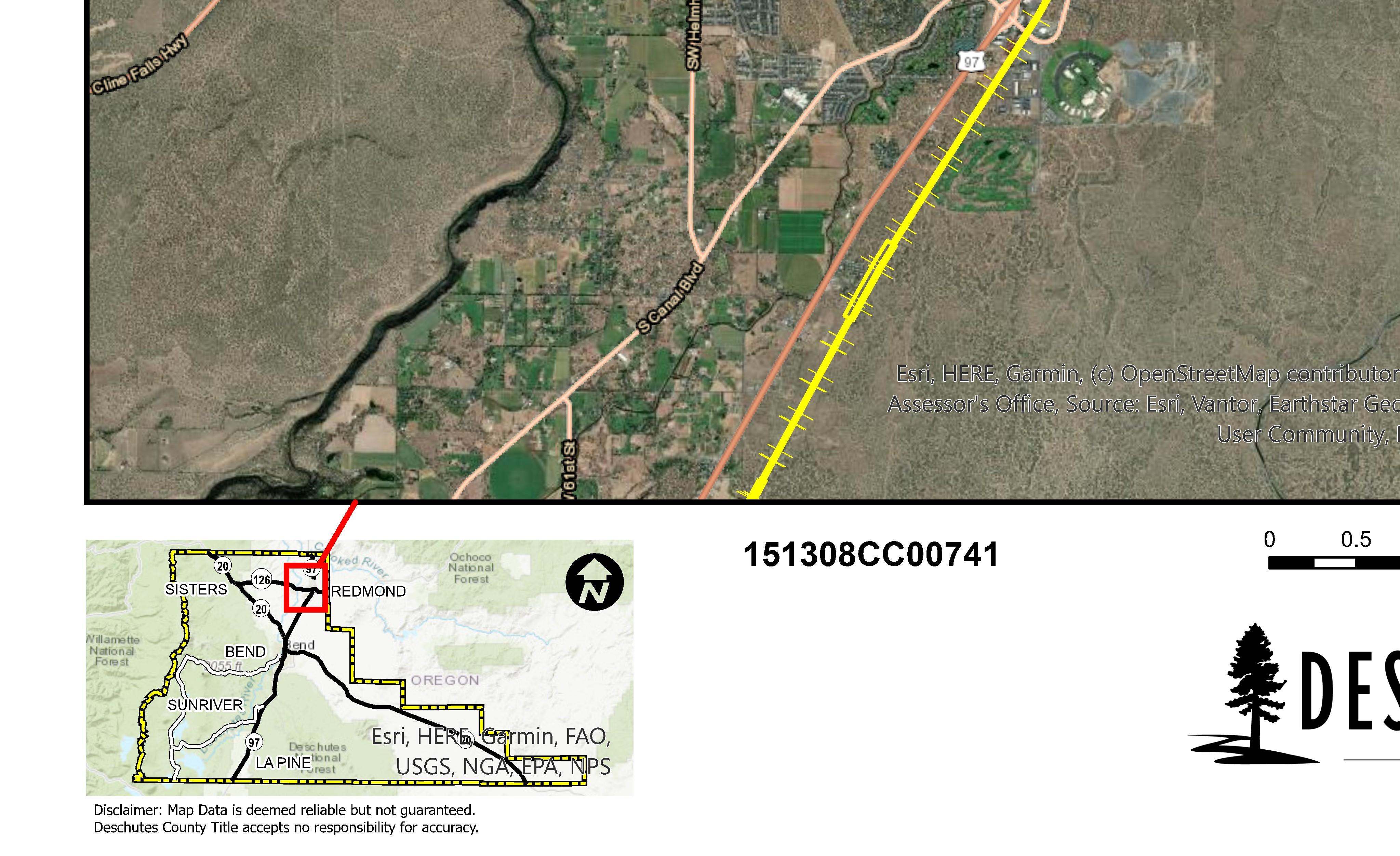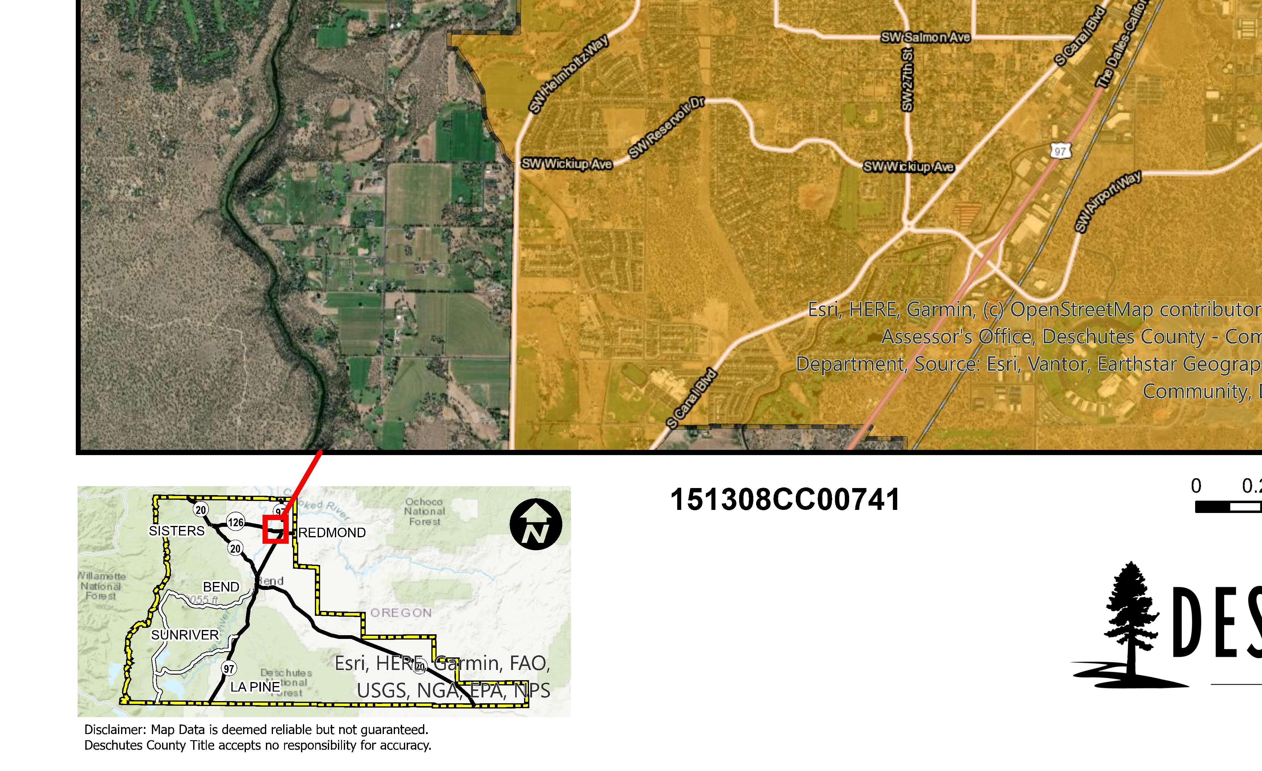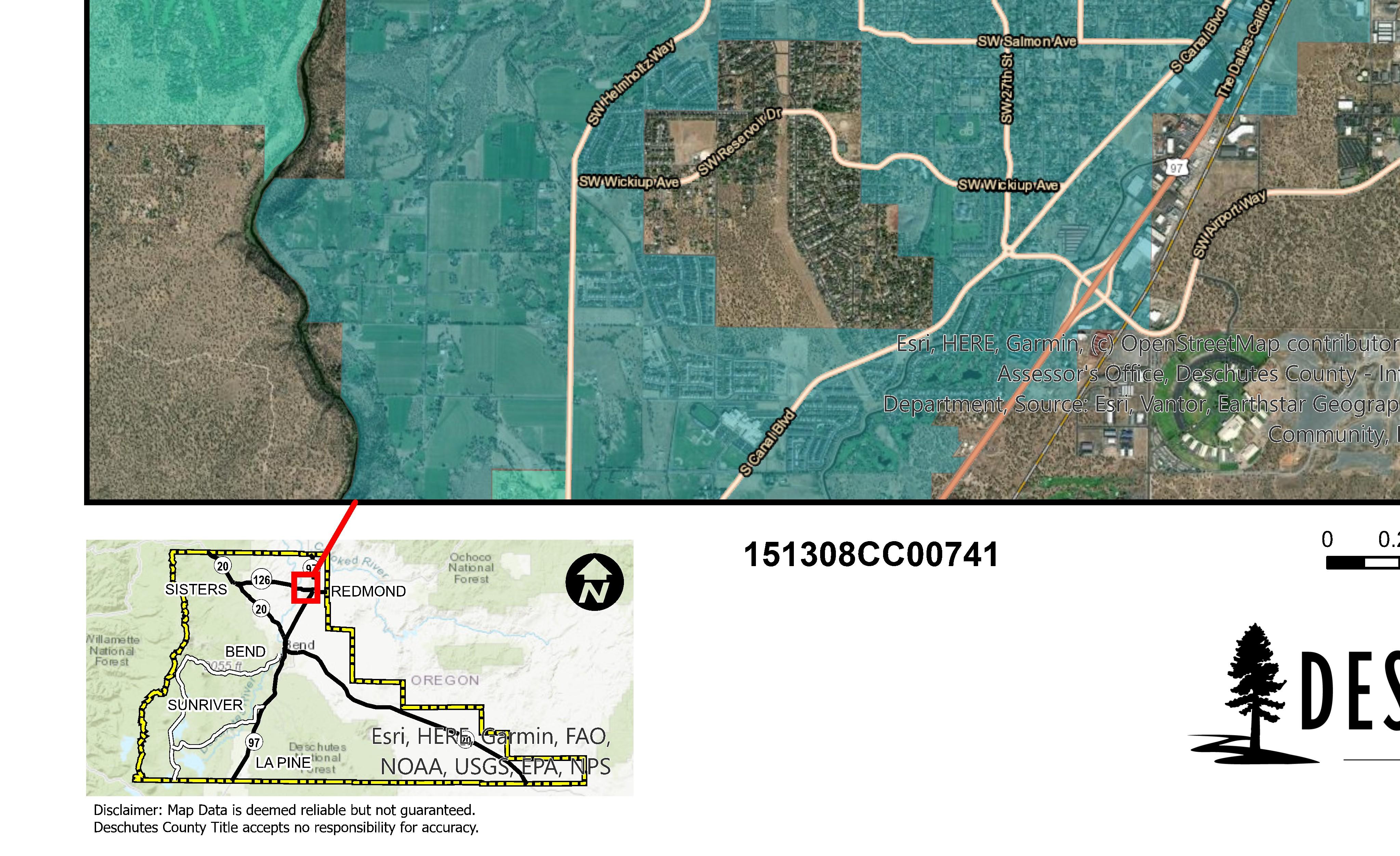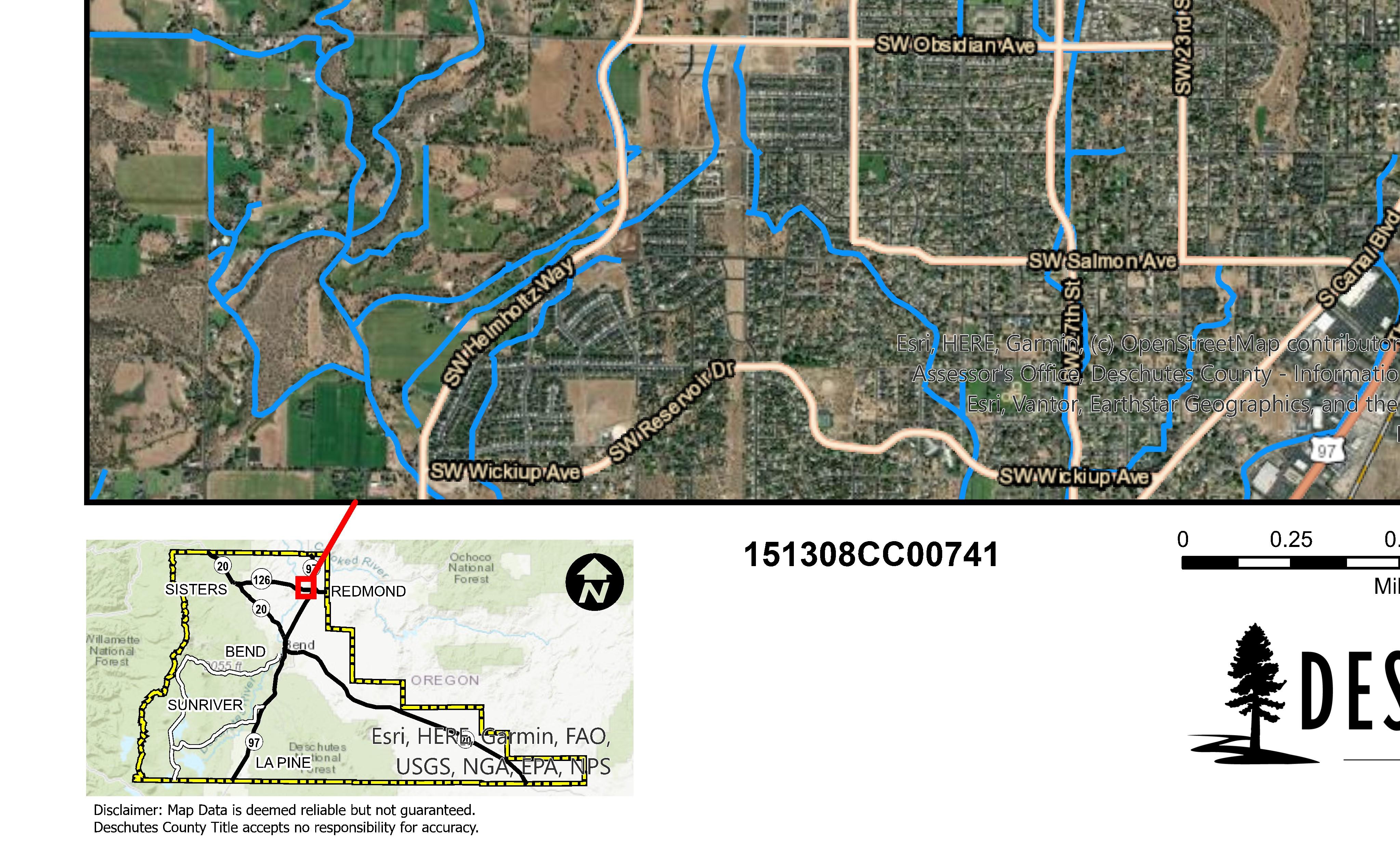 The information and maps presented in this report are provided for your convenience. Every reasonable effort has been made to assure the accuracy of the data and associated maps. Deschutes County makes no warranty, representation or guarantee as to the content, sequence, accuracy, timeliness or completeness of any of the data provided herein. Deschutes County explicitly disclaims any representations and warranties, including, without limitation, the implied warranties of merchantability and fitness for a particular purpose. Deschutes County shall assume no liability for any errors, omissions, or inaccuracies in the information provided regardless of how caused. Deschutes County assumes no liability for any decisions made or actions taken or not taken by the user of this information or data furnished hereunder.