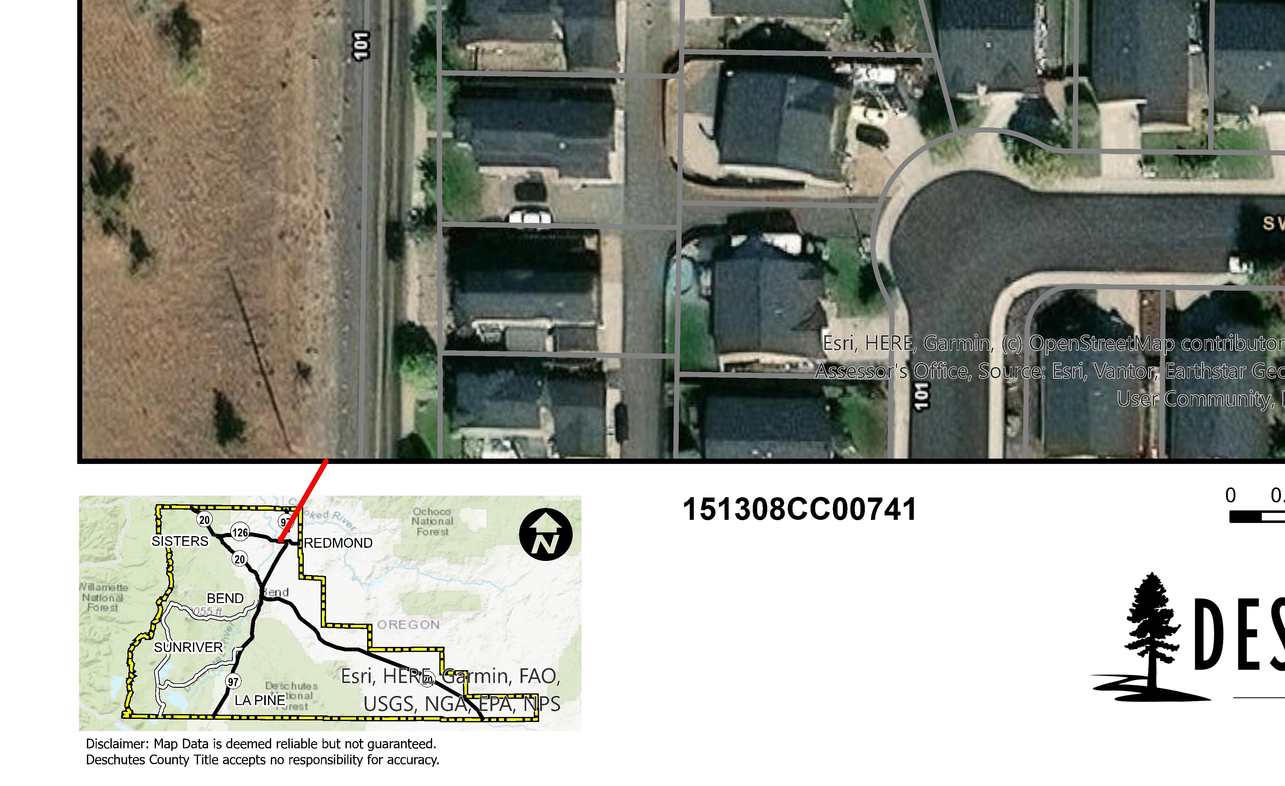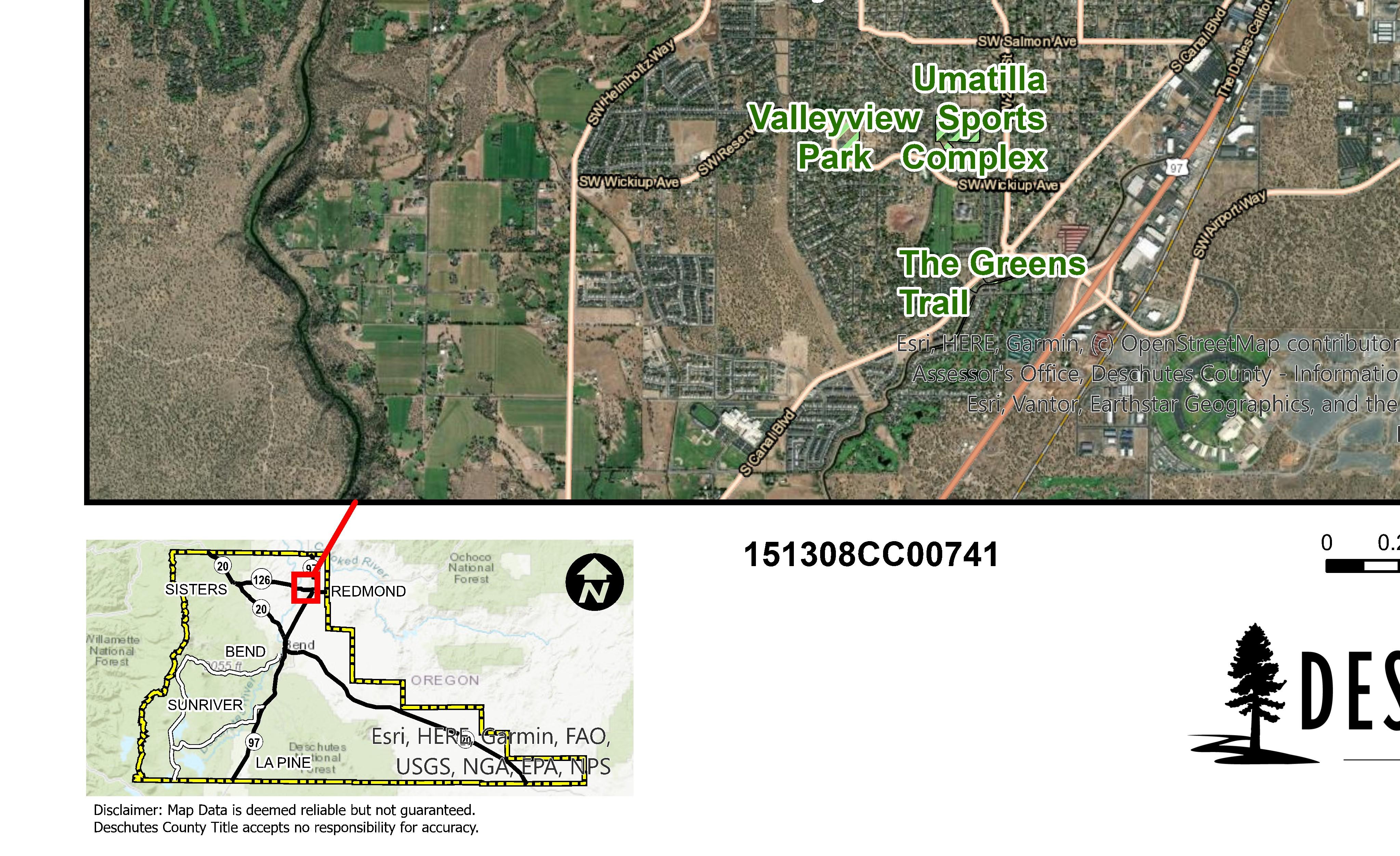 Review of digital records maintained by the Deschutes County Assessor’s Office, Tax Office, Finance Office, and the Community Development Department indicates that there are no special tax, assessment or property development related notations associated with this account. However, independent verification of the presence of other Deschutes County tax, assessment, development, and additional property related considerations is recommended. Confirmation is commonly provided by title companies, real estate agents, developers, engineering and surveying firms, and other parties who are involved in property transactions or property development. In addition, County departments may be contacted directly to discuss the information.