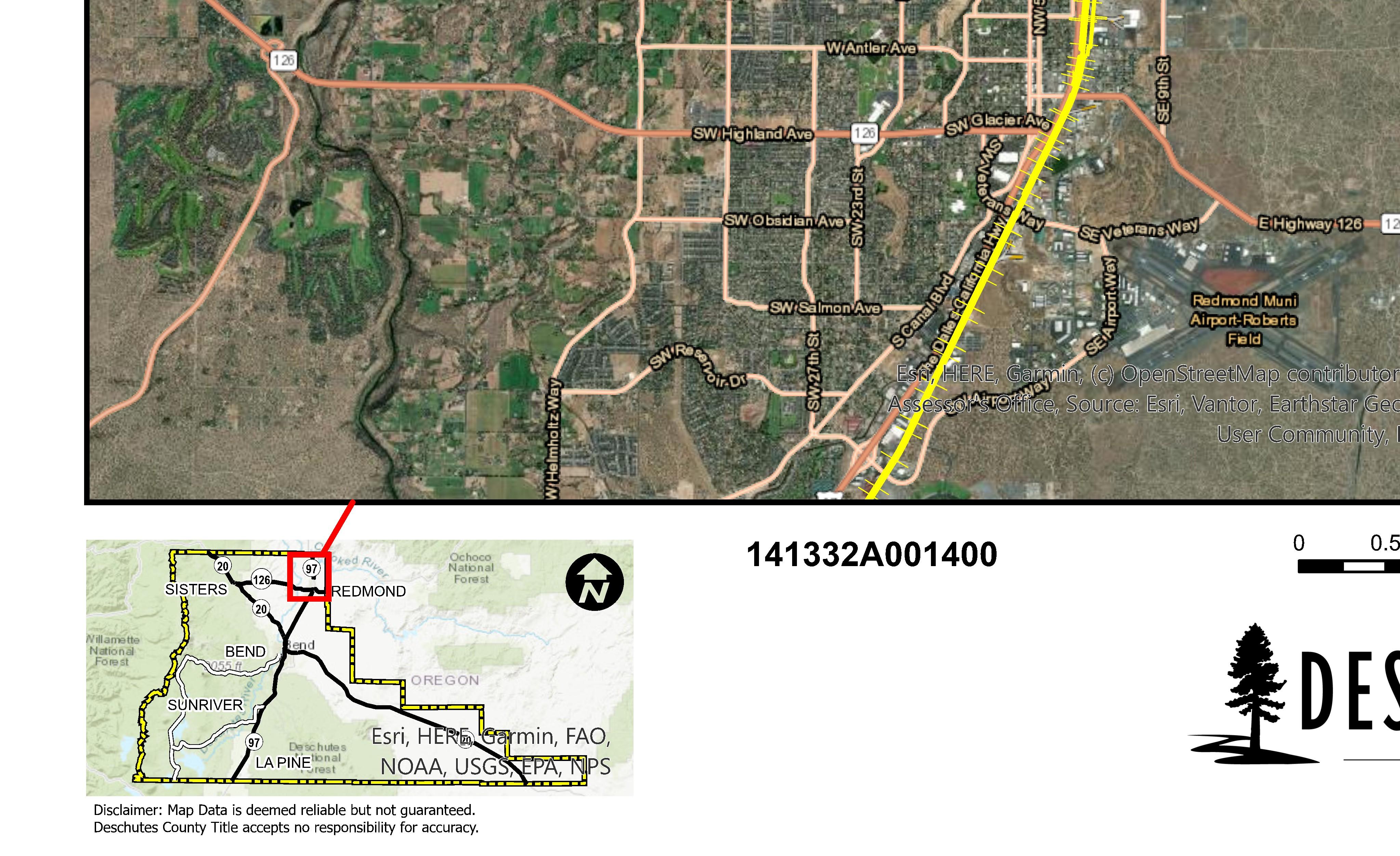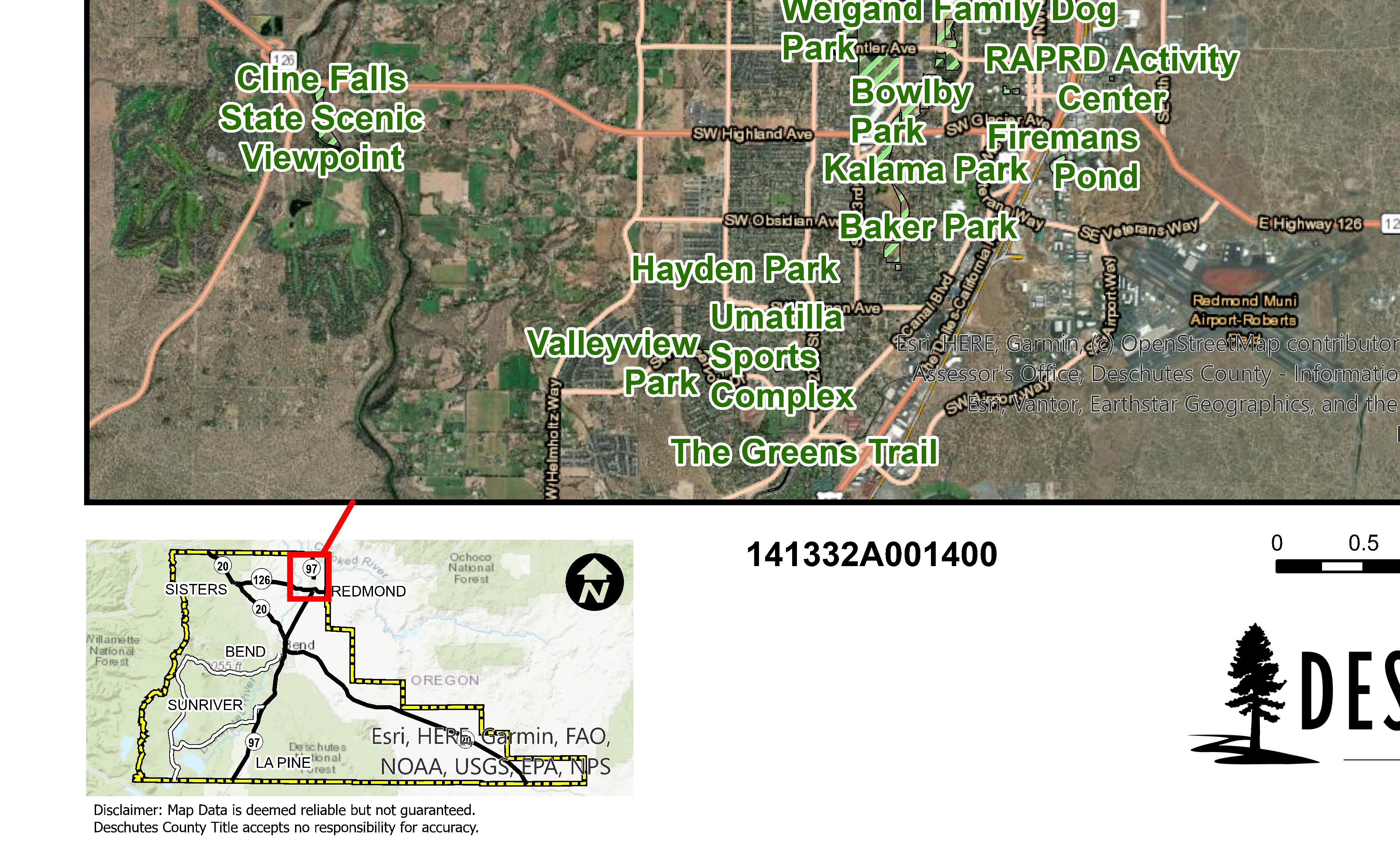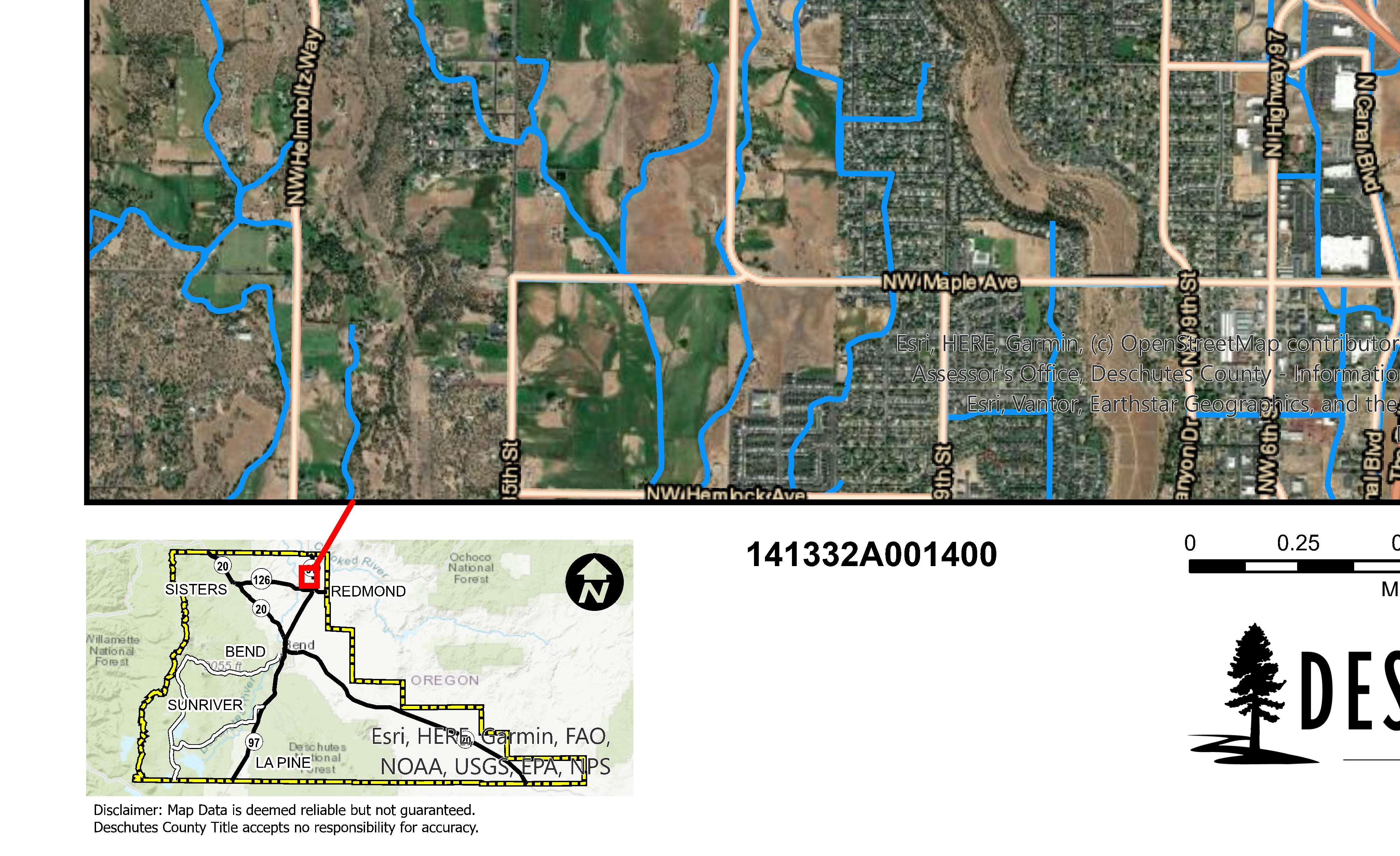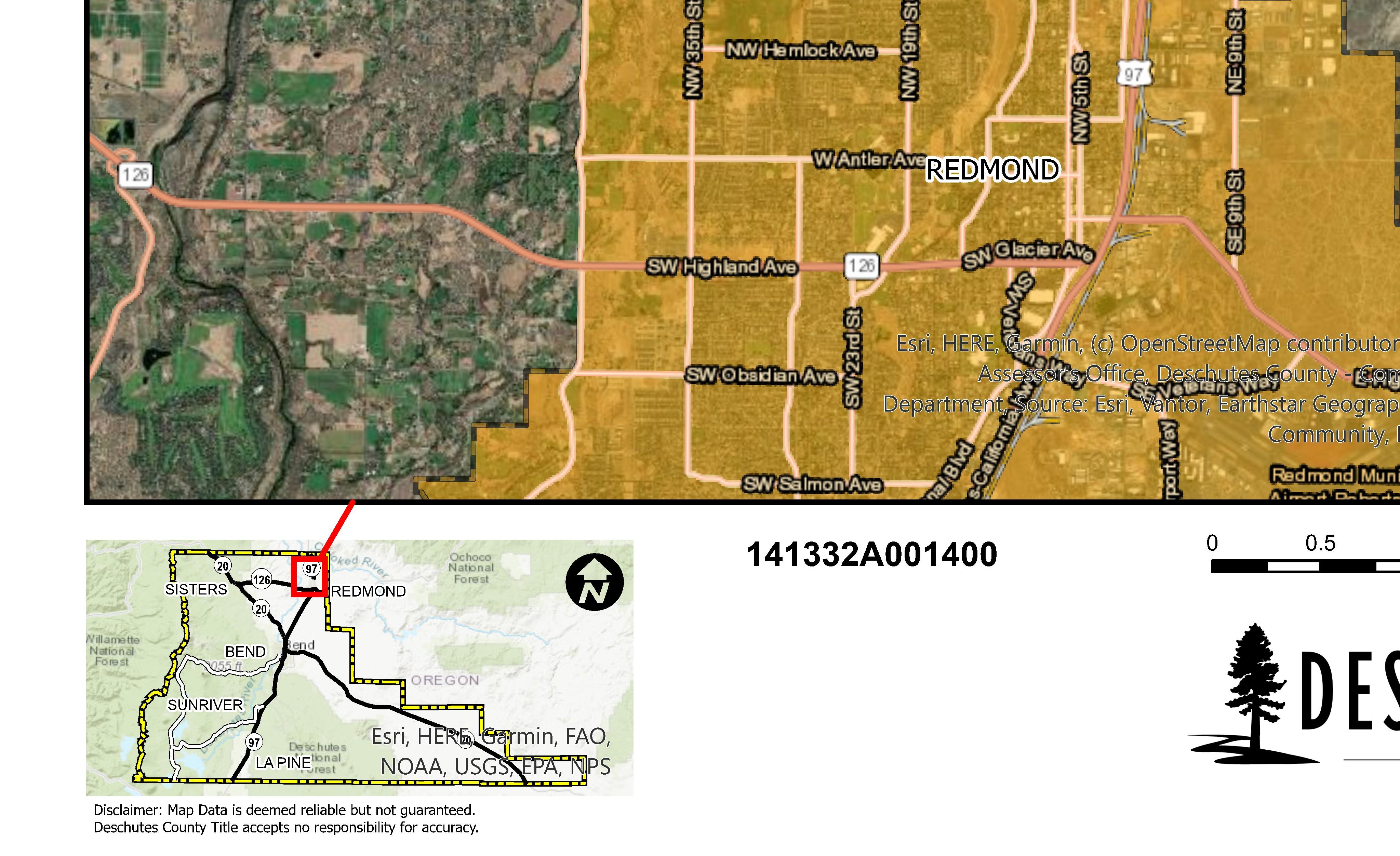 The information and maps presented in this report are provided for your convenience. Every reasonable effort has been made to assure the accuracy of the data and associated maps. Deschutes County makes no warranty, representation or guarantee as to the content, sequence, accuracy, timeliness or completeness of any of the data provided herein. Deschutes County explicitly disclaims any representations and warranties, including, without limitation, the implied warranties of merchantability and fitness for a particular purpose. Deschutes County shall assume no liability for any errors, omissions, or inaccuracies in the information provided regardless of how caused. Deschutes County assumes no liability for any decisions made or actions taken or not taken by the user of this information or data furnished hereunder.