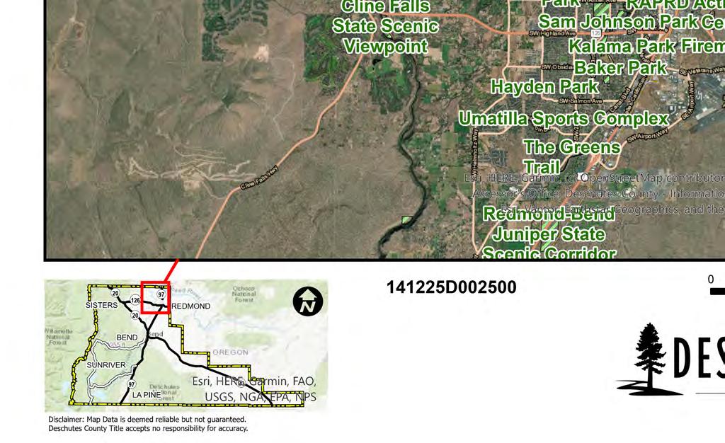 The information and maps presented in this report are provided for your convenience. Every reasonable effort has been made to assure the accuracy of the data and associated maps. Deschutes County makes no warranty, representation or guarantee as to the content, sequence, accuracy, timeliness or completeness of any of the data provided herein. Deschutes County explicitly disclaims any representations and warranties, including, without limitation, the implied warranties of merchantability and fitness for a particular purpose. Deschutes County shall assume no liability for any errors, omissions, or inaccuracies in the information provided regardless of how caused. Deschutes County assumes no liability for any decisions made or actions taken or not taken by the user of this information or data furnished hereunder.